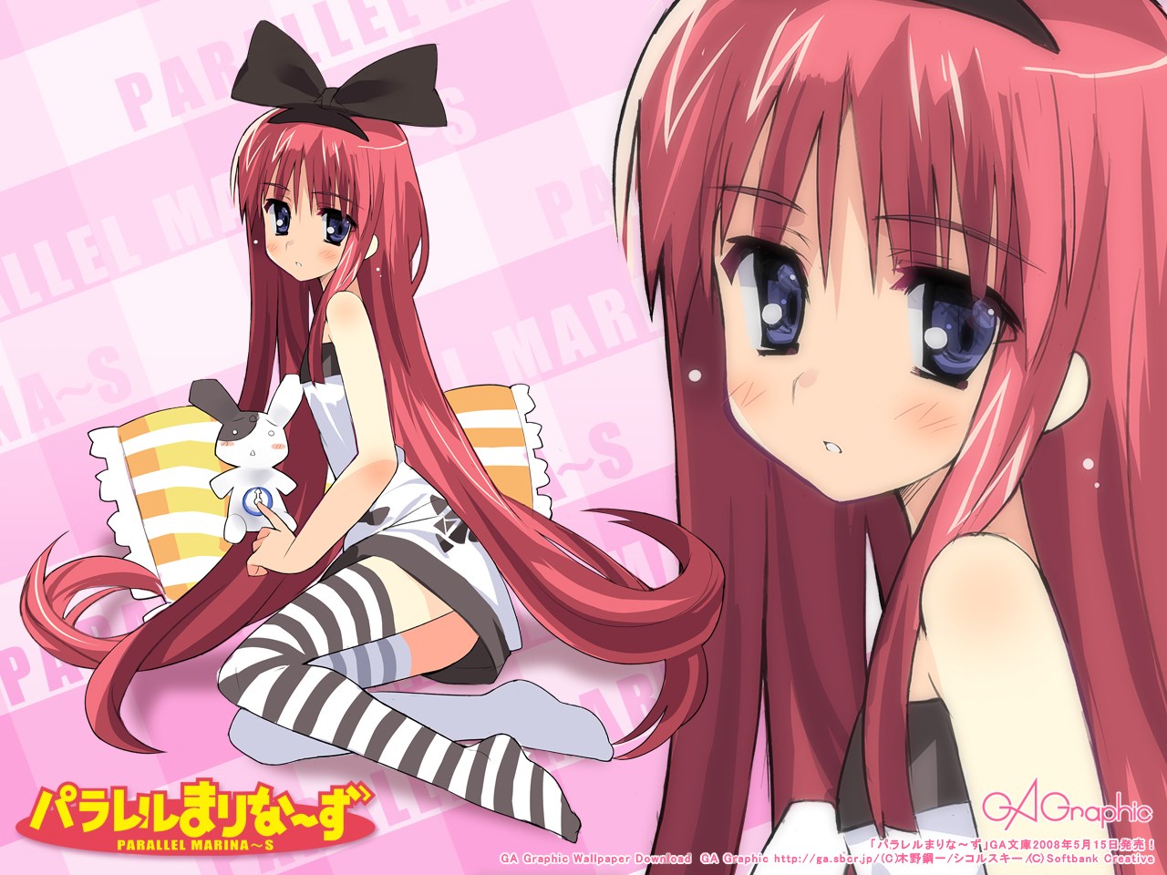 Description: A girl with long pink hair sitting on a bed with a black bow on her head and a pink background.