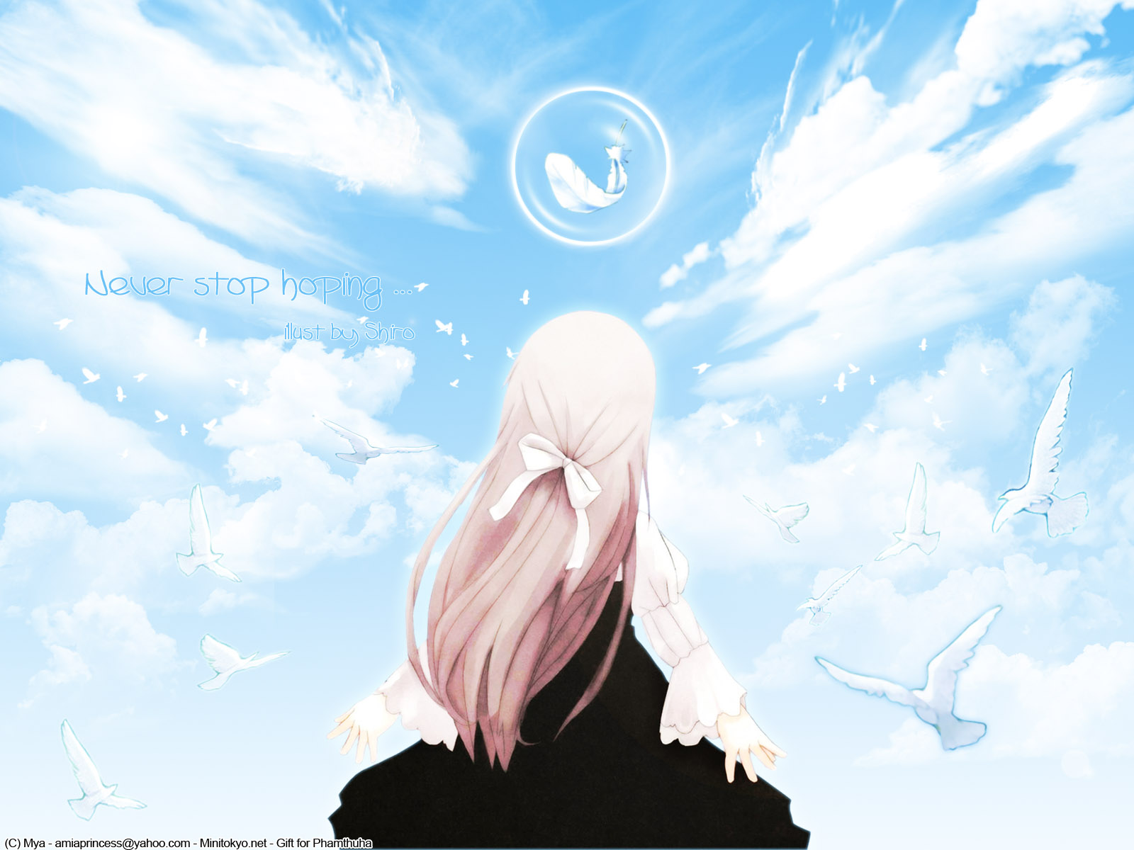 Description: A girl with long pink hair looking at a sky with birds flying around her and a dove in the sky.