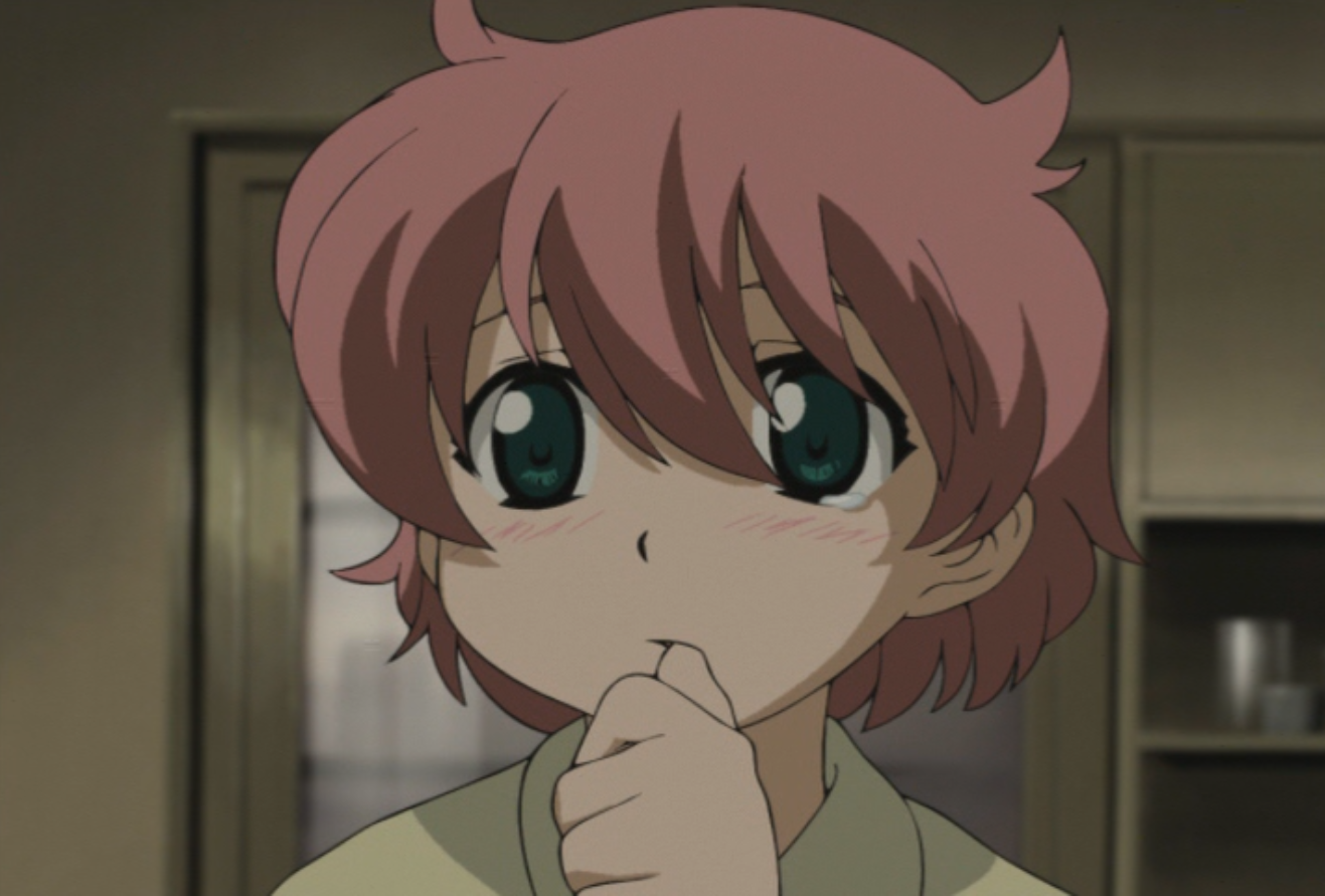 Description: A girl with pink hair and green eyes looks at the camera with a finger on her mouth and a hand on her chin.