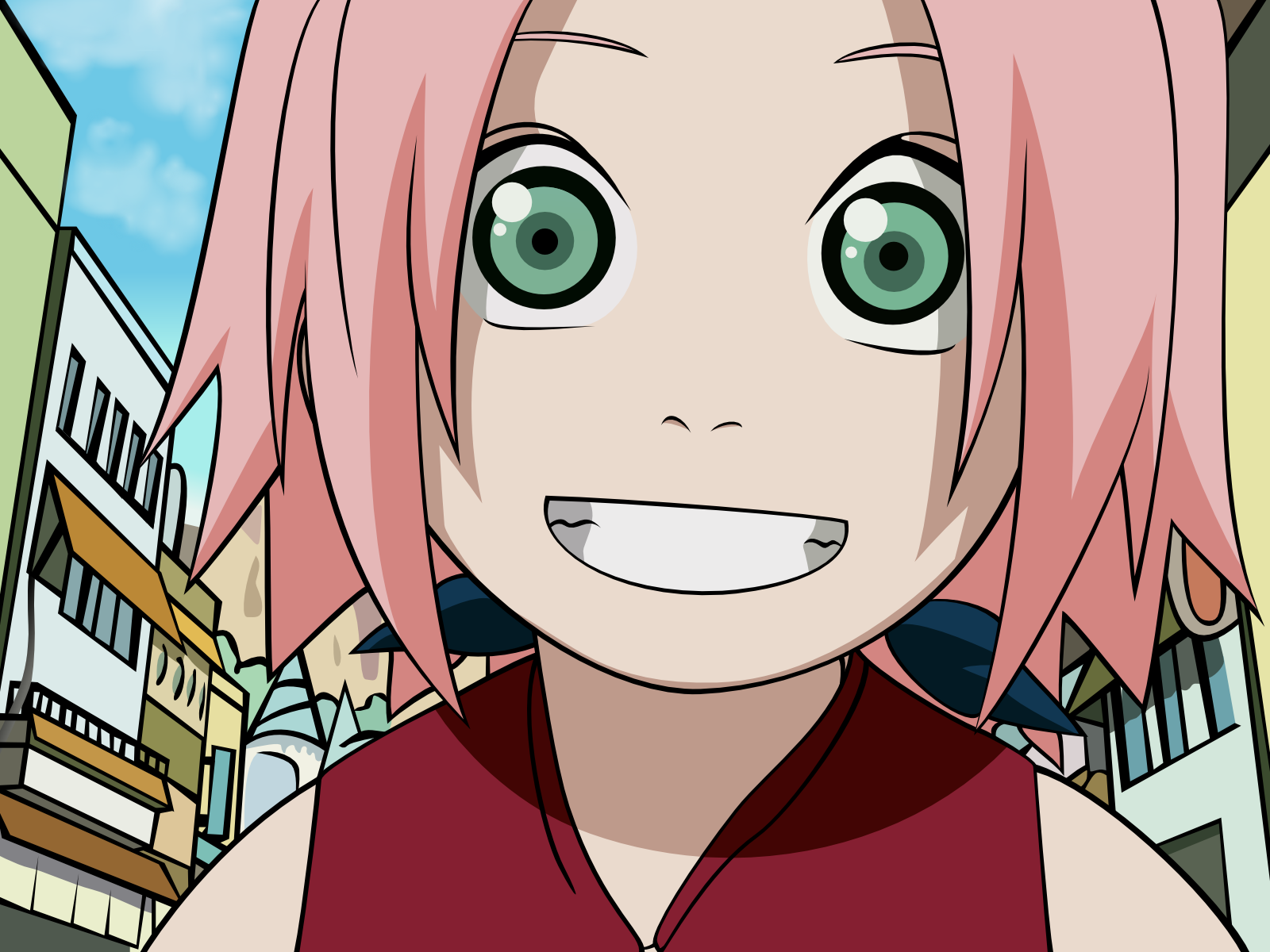 Description: A girl with pink hair and green eyes in a city setting with buildings and buildings in the background.