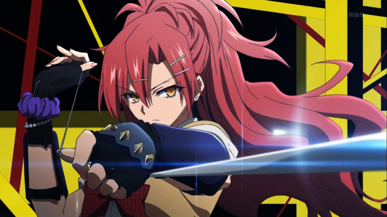 Description: A girl with pink hair holding a sword in front of a yellow background with a black background and a yellow and red background.