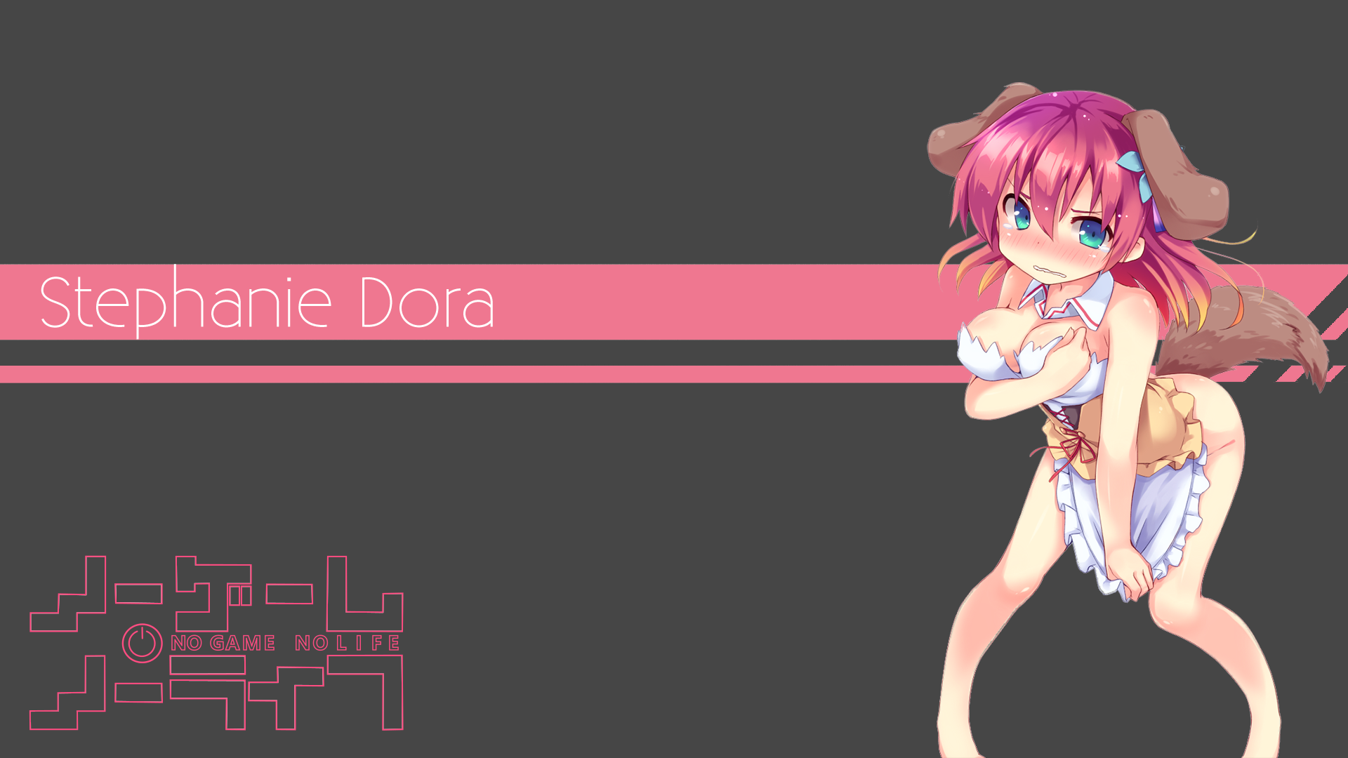 Description: A girl with pink hair and a white dress is standing in front of a pink ribbon with the words stephanie dora.
