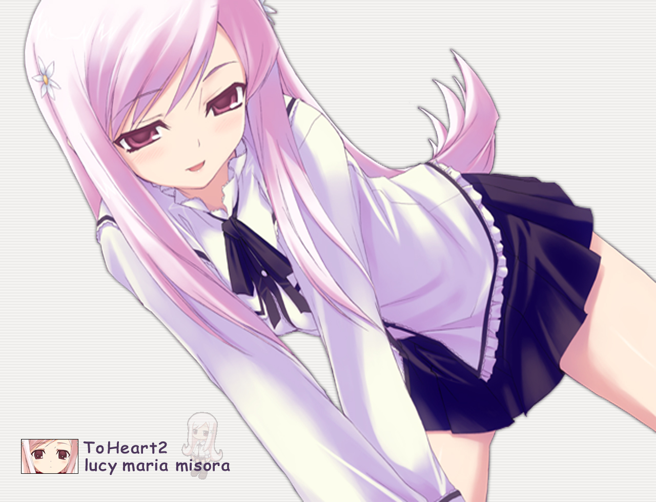 Description: A girl with pink hair and a white shirt and black skirt is posing for a picture with her arms behind her back.