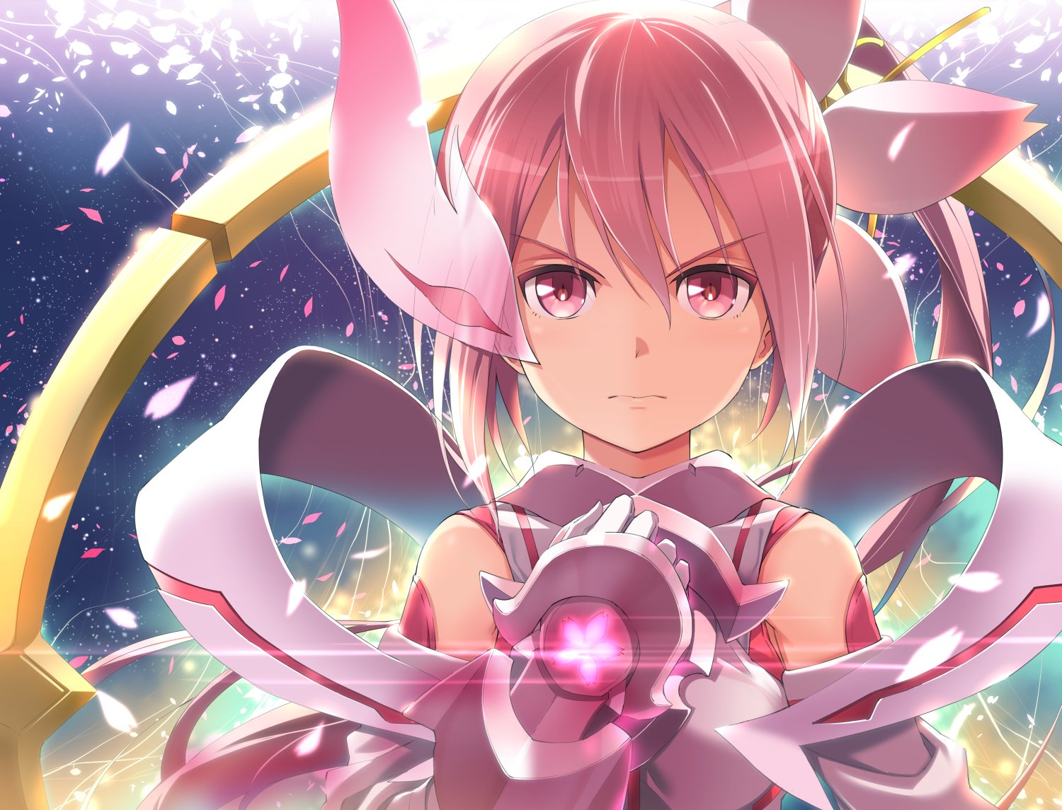 Description: A girl with pink hair and a pink dress holding a pink object in her hands and a purple background.