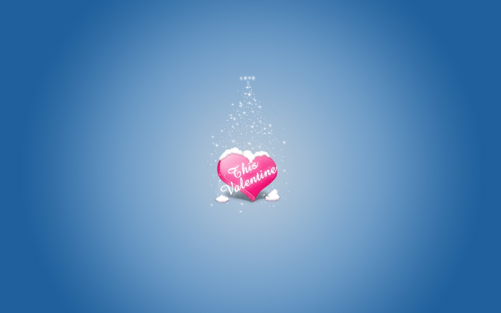 Description: A pink heart with a message on it floating in the air with snow around it and a blue background.