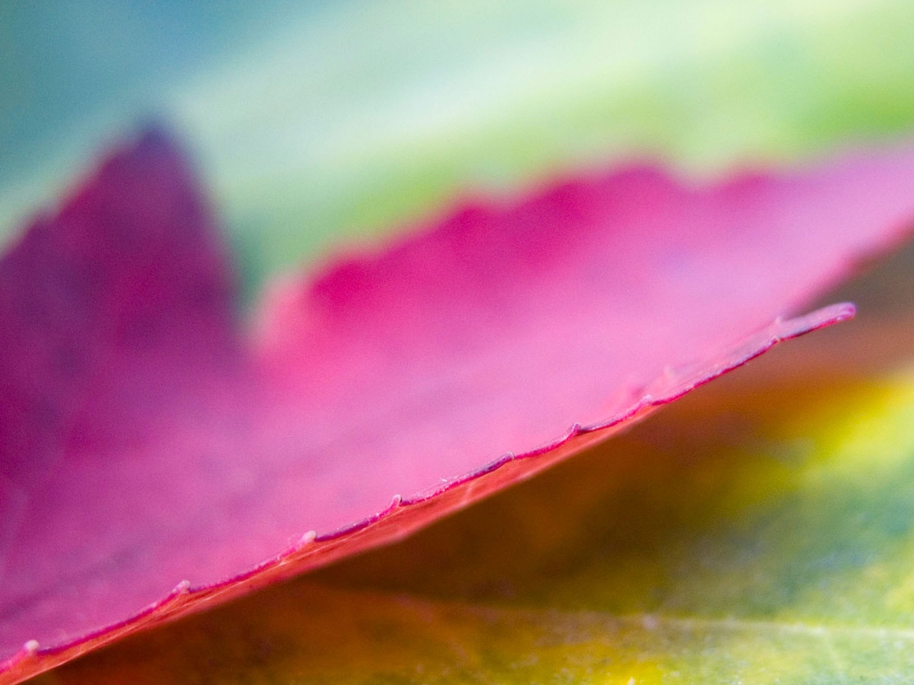 Description: A close up of a pink leaf on a green leafy surface with a blue background and a yellow center.