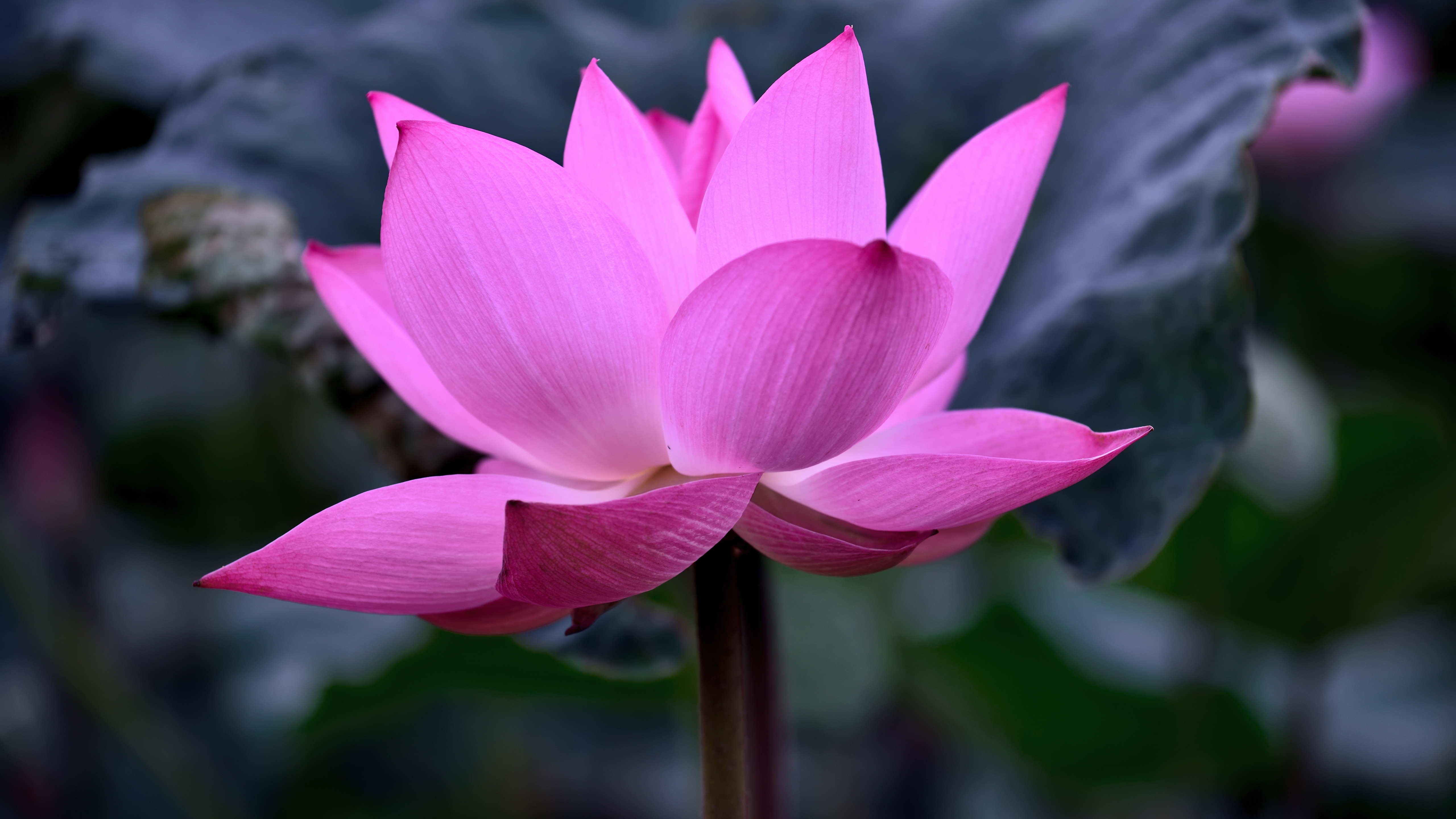 Description: A pink lotus flower with a green leaf in the background and a blue sky in the background with a few clouds.