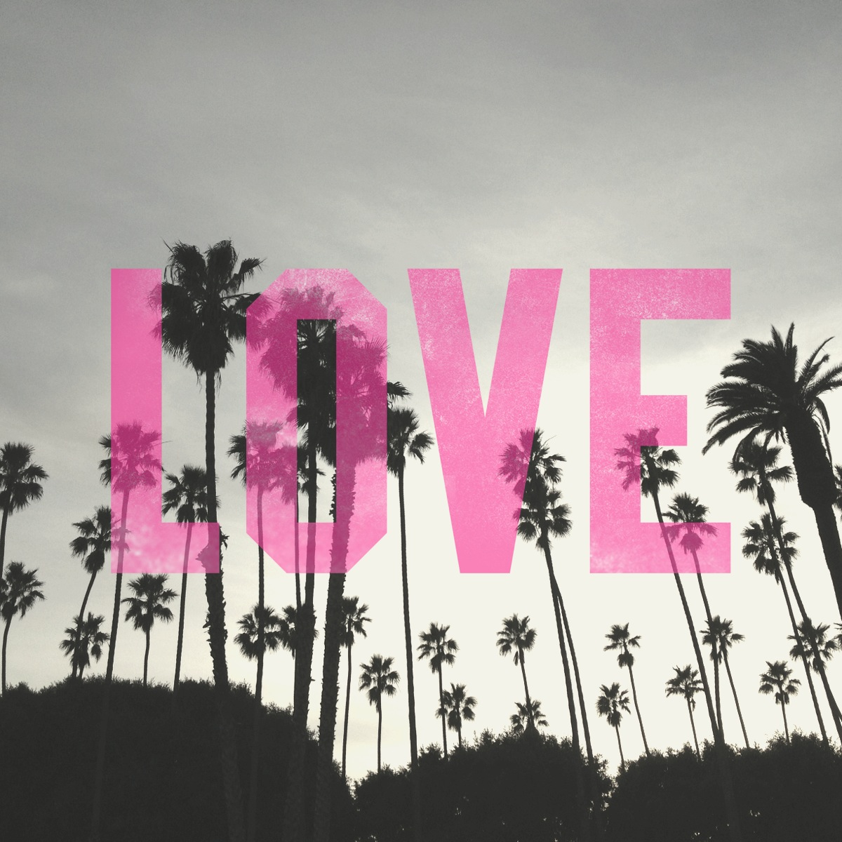 Description: A pink love sign surrounded by palm trees and a cloudy sky in the background with a pink heart in the middle.