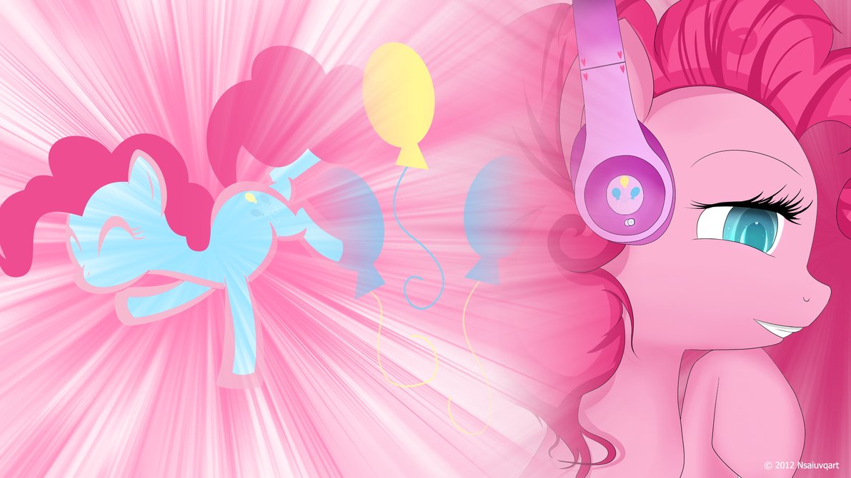 Description: A pink pony with headphones on and a pink background with balloons and stars in the sky behind it.