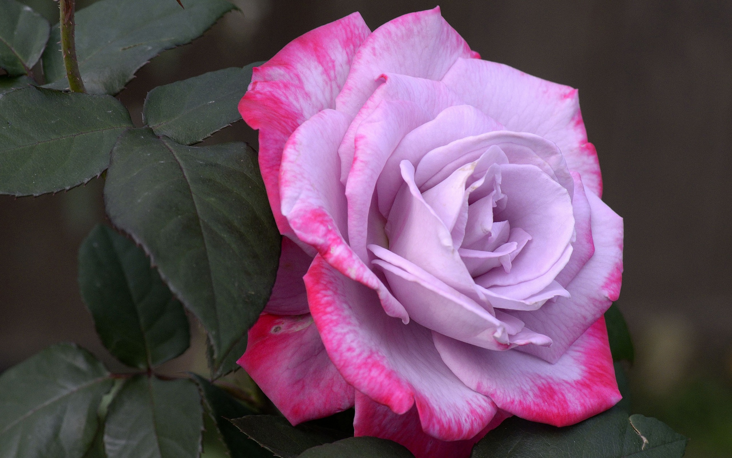 Description: A pink and white rose with green leaves on a branch in the sun light of the day.