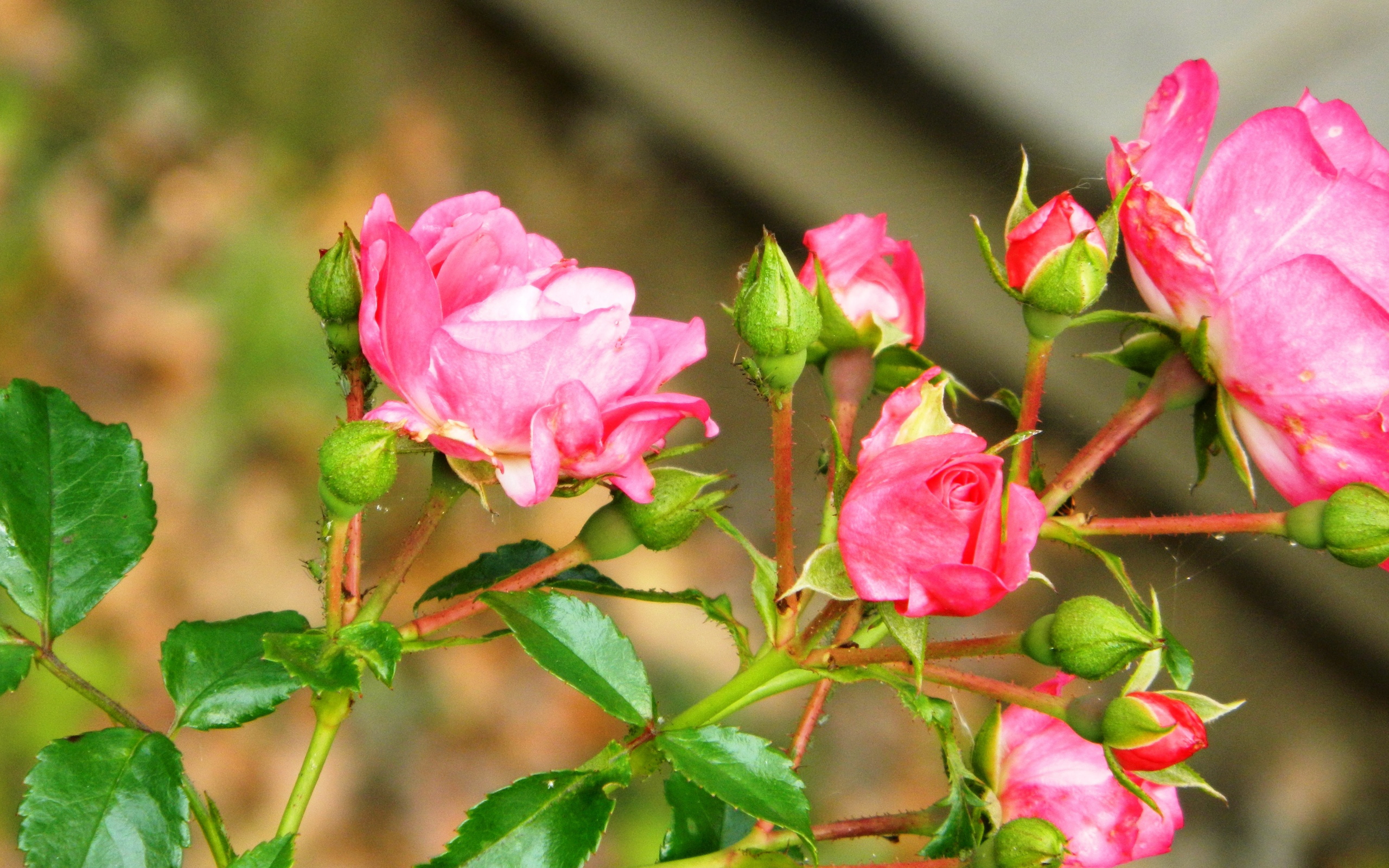 Description: A pink flower with green leaves on a branch in the sun light of the day.