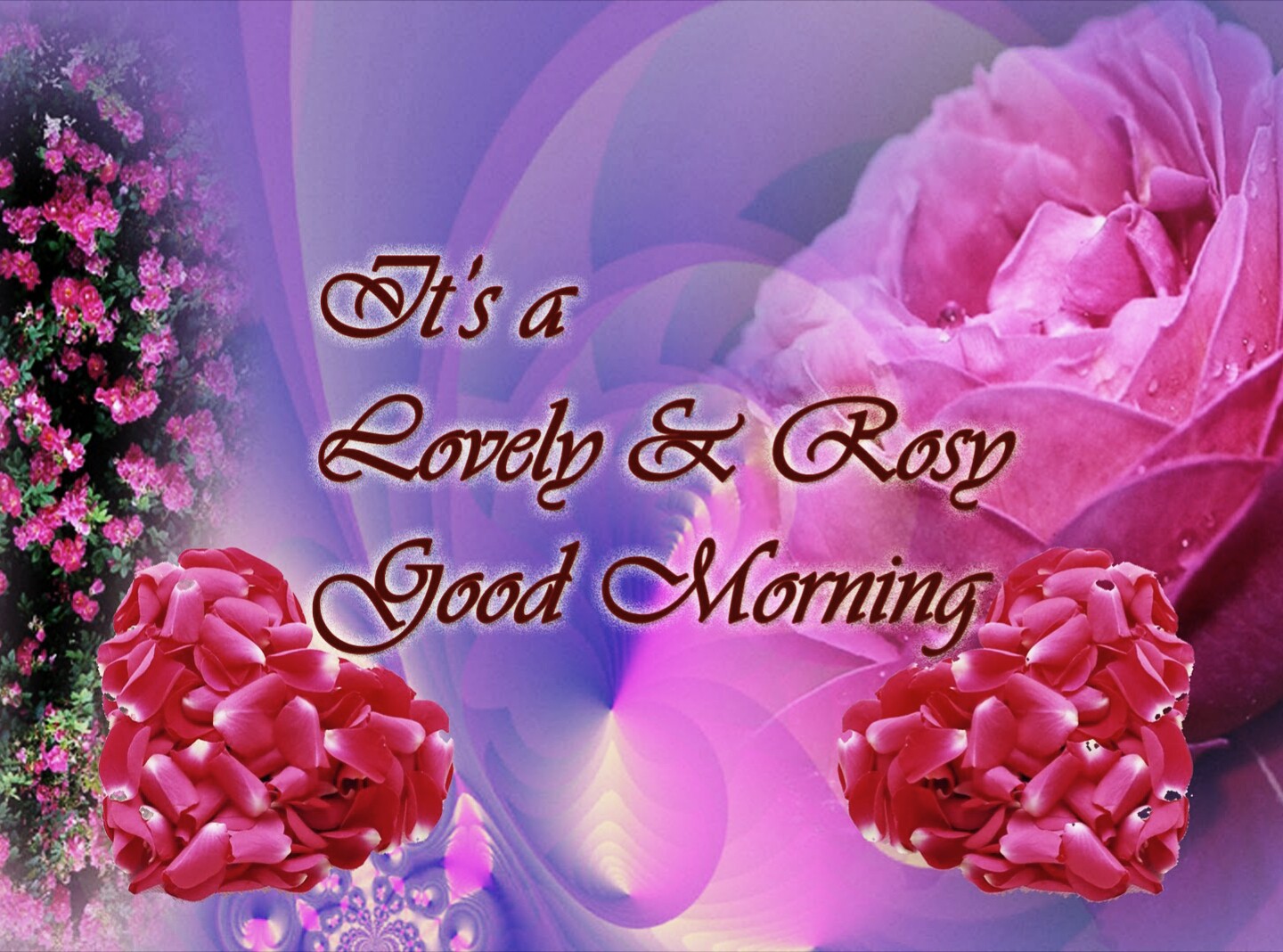 Description: A pink flower and a pink rose with a purple background and words it's a lovely and rosy good morning.