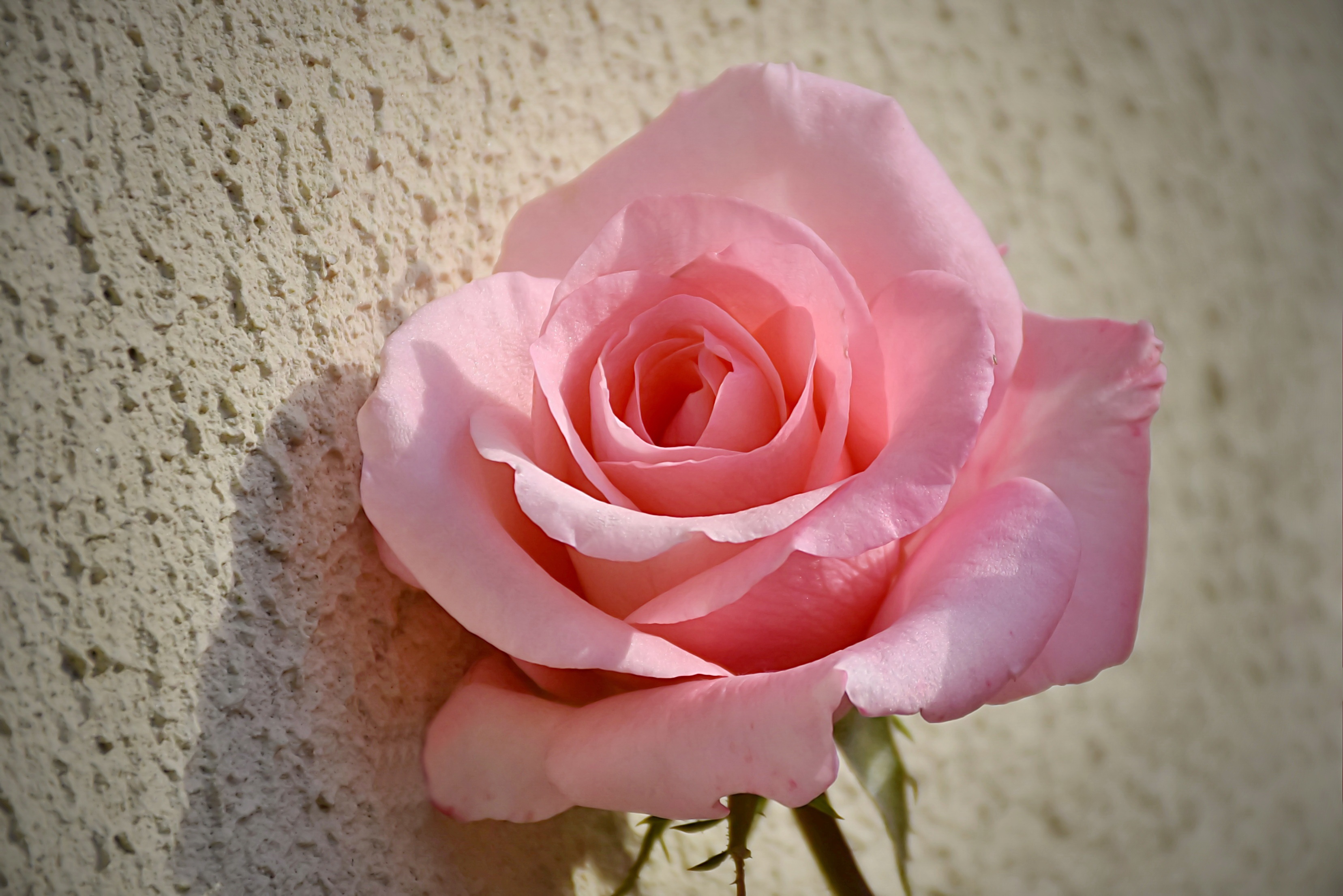 Description: A pink rose is sitting on a wall with a shadow on it's side and a shadow on the wall behind it.