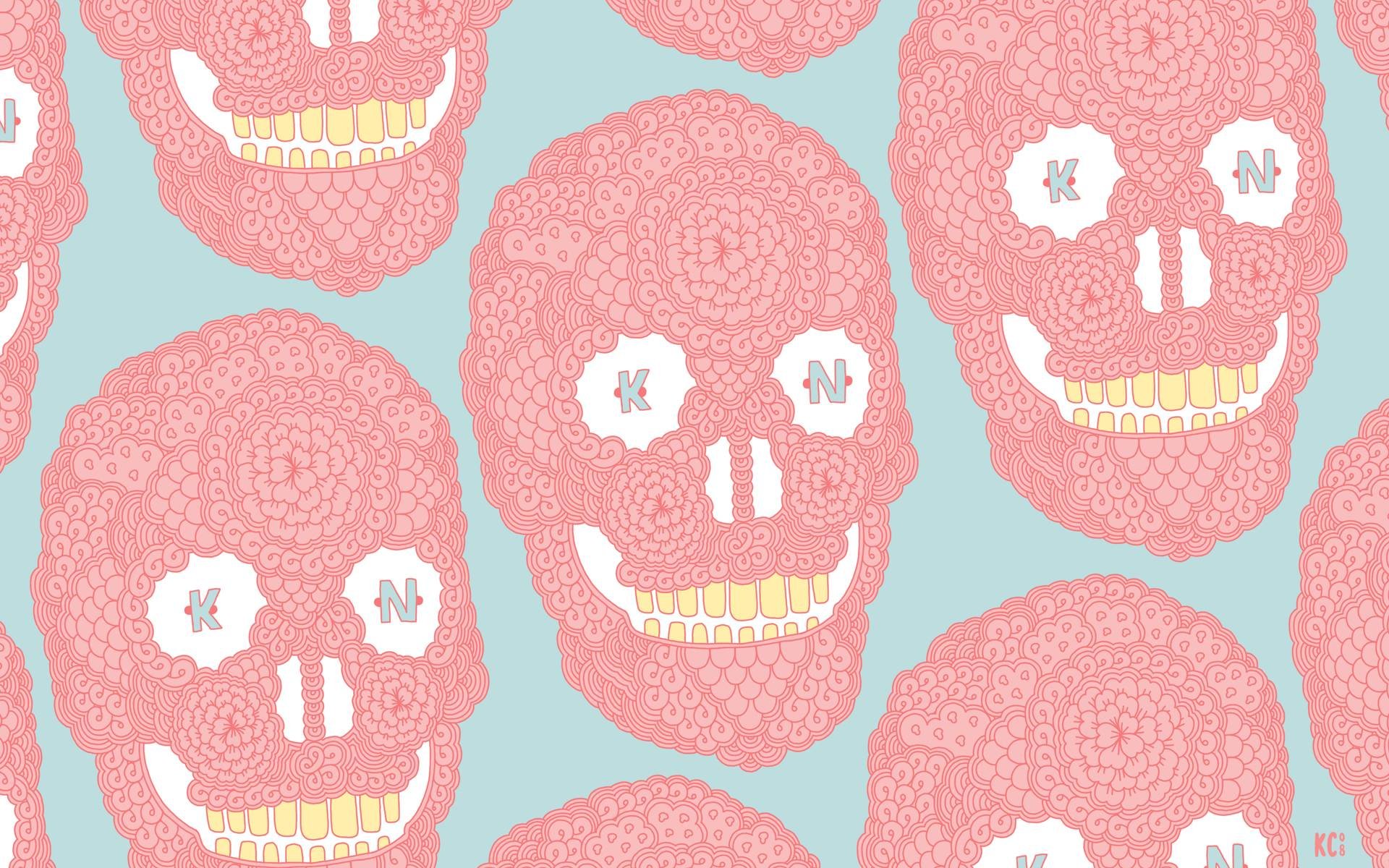 Description: A pink skull with a yellow mouth and teeth on a blue background with white dots and a yellow tooth.
