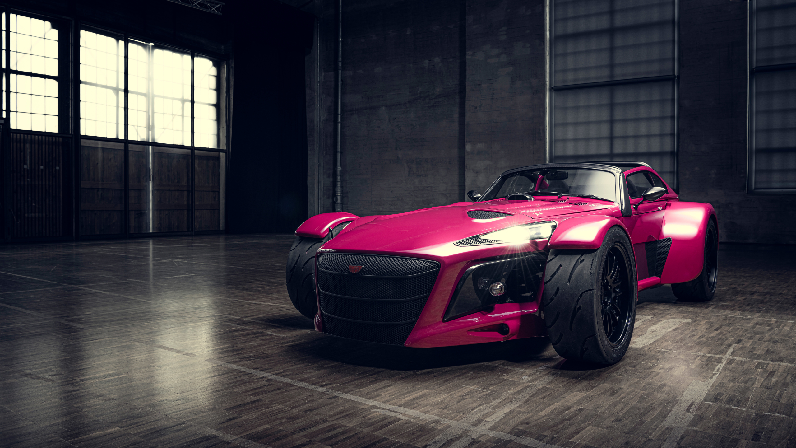 Description: A pink sports car parked in a garage with a window open and a wooden floor in front of it.