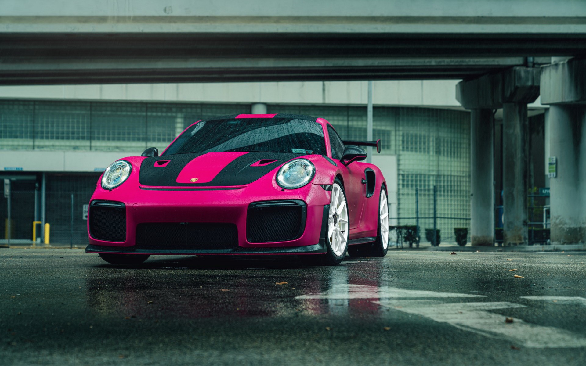 Description: A pink sports car parked in front of a building on a rainy day with a parking meter in the background.