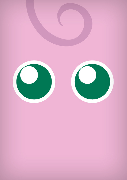 Description: A pink square with two green eyes and a spiral design on the front of it.