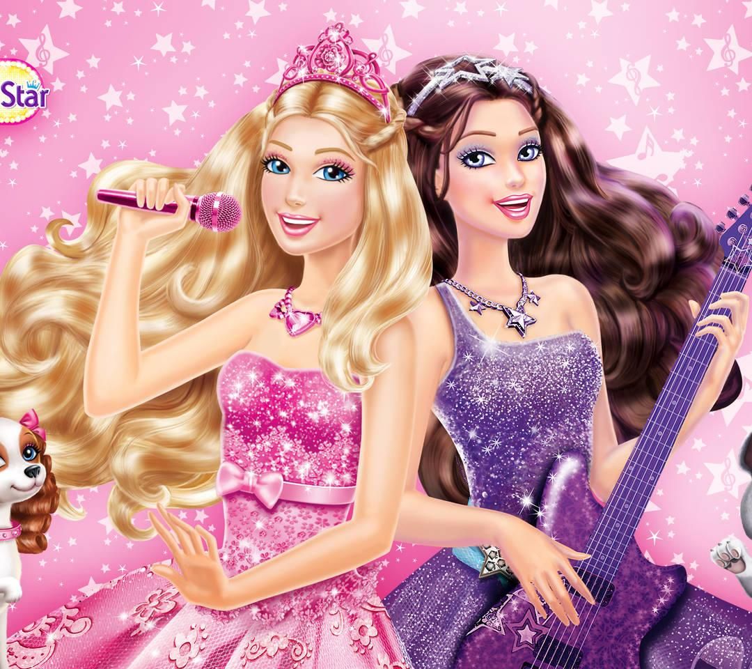 Description: A barbie doll and a dog are in a pink background with stars and a pink guitar and a pink background with a white dog.