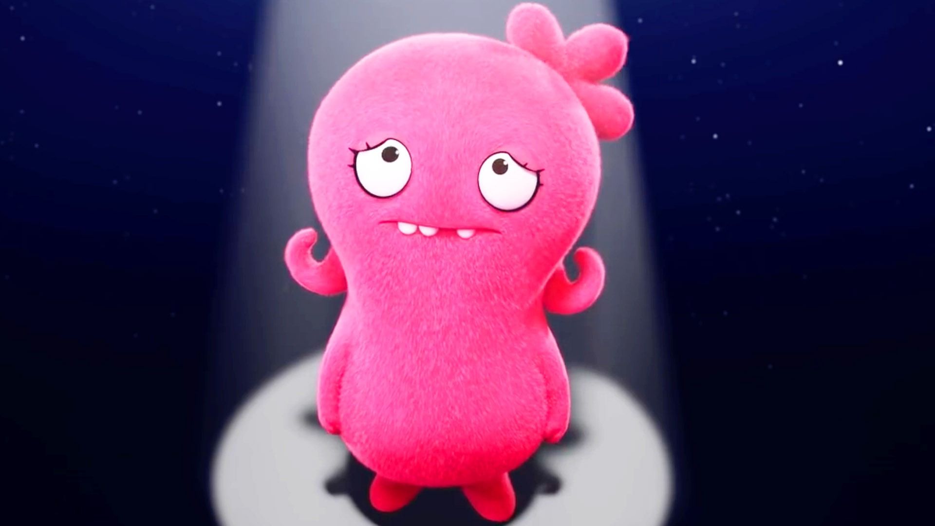 Description: A pink stuffed animal sitting on top of a white object in the dark night sky with stars in the background.