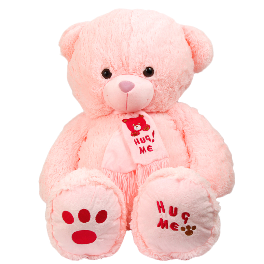 Description: A pink teddy bear with a red paw print on it's chest and a white shirt with a red heart on it.