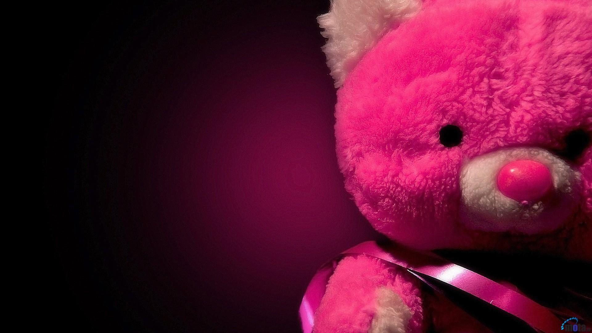 Description: A pink teddy bear with a pink ribbon around its neck and a pink bow around its neck.