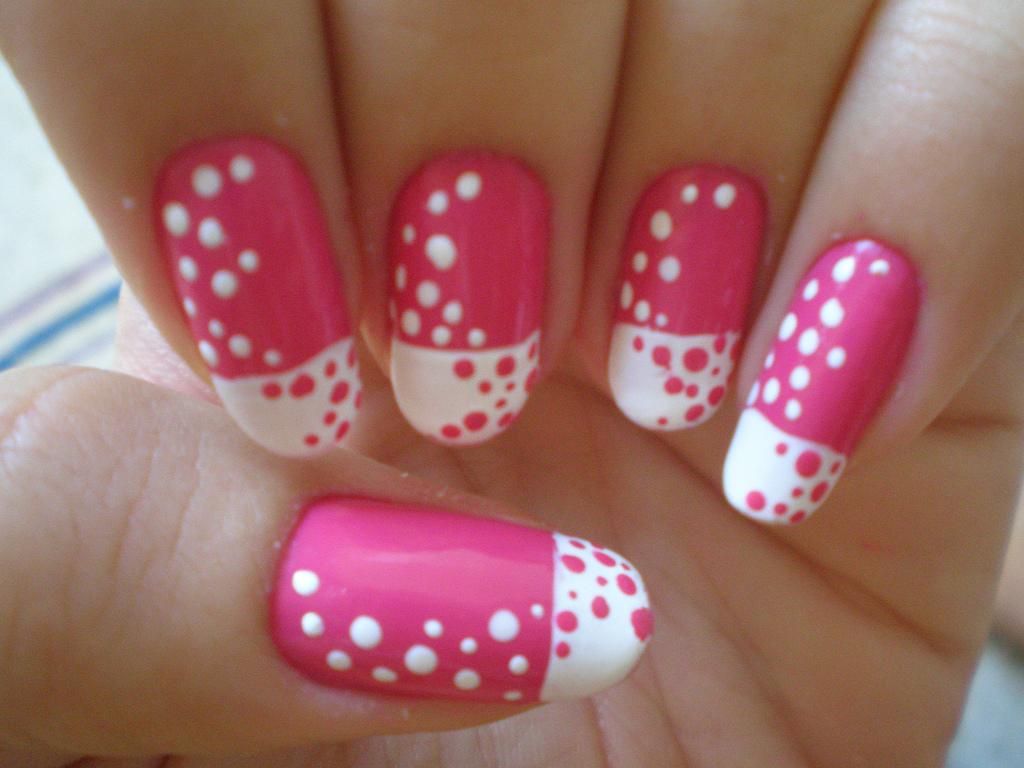 Description: A person with pink and white polka dot nail art on their nails and a pink and white polka dot nail art on their nails.