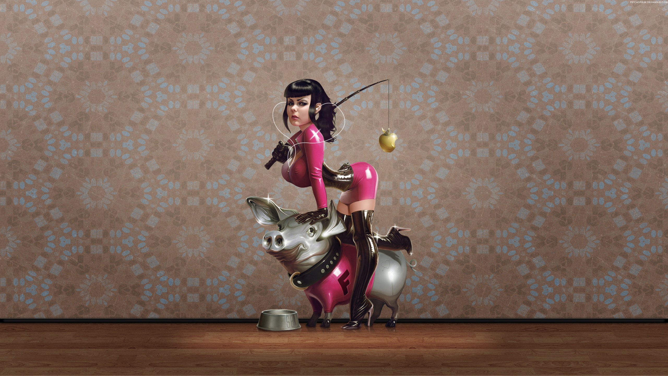 Description: A woman in a pink outfit is riding a pig with a sword and a bowl of food in her hand.