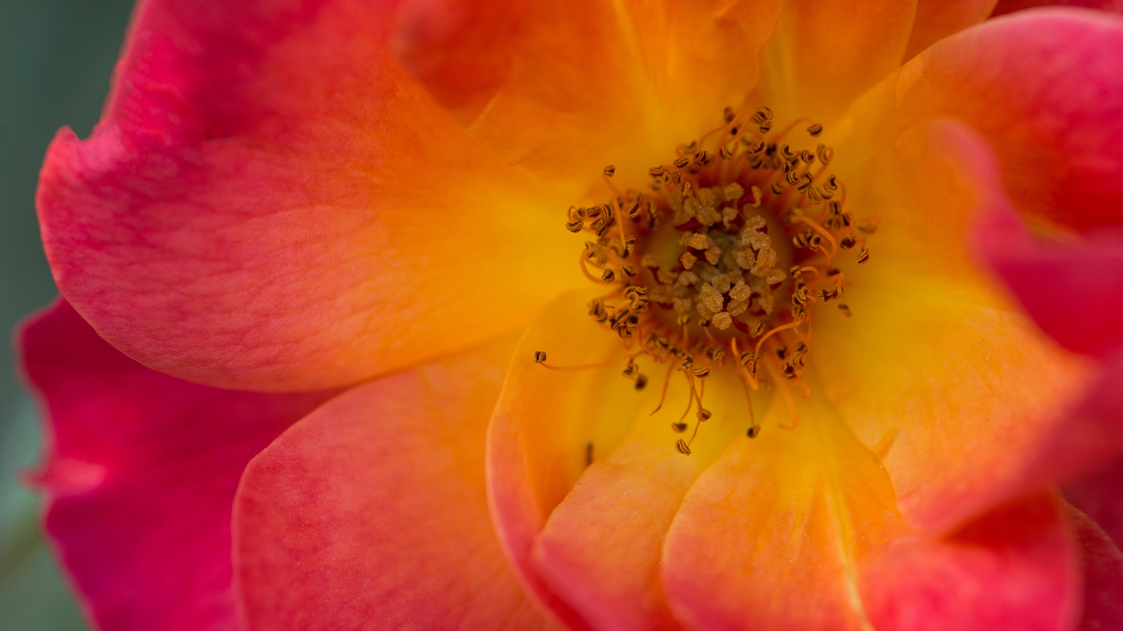 Description: A close up of a pink and yellow flower with a green background and a yellow center and a yellow center.