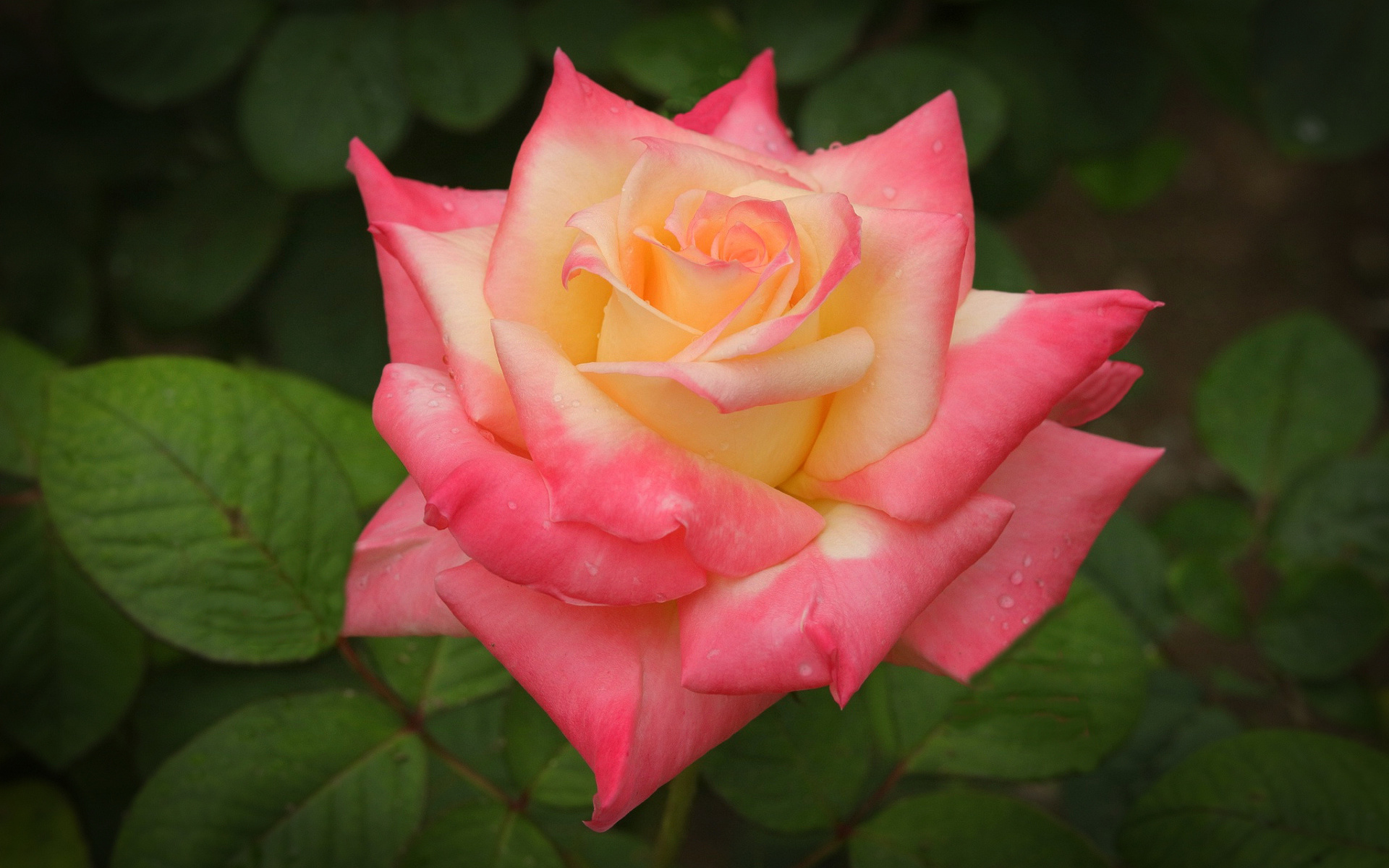 Description: A pink and yellow rose with green leaves in the background and a green background with a few leaves on it.
