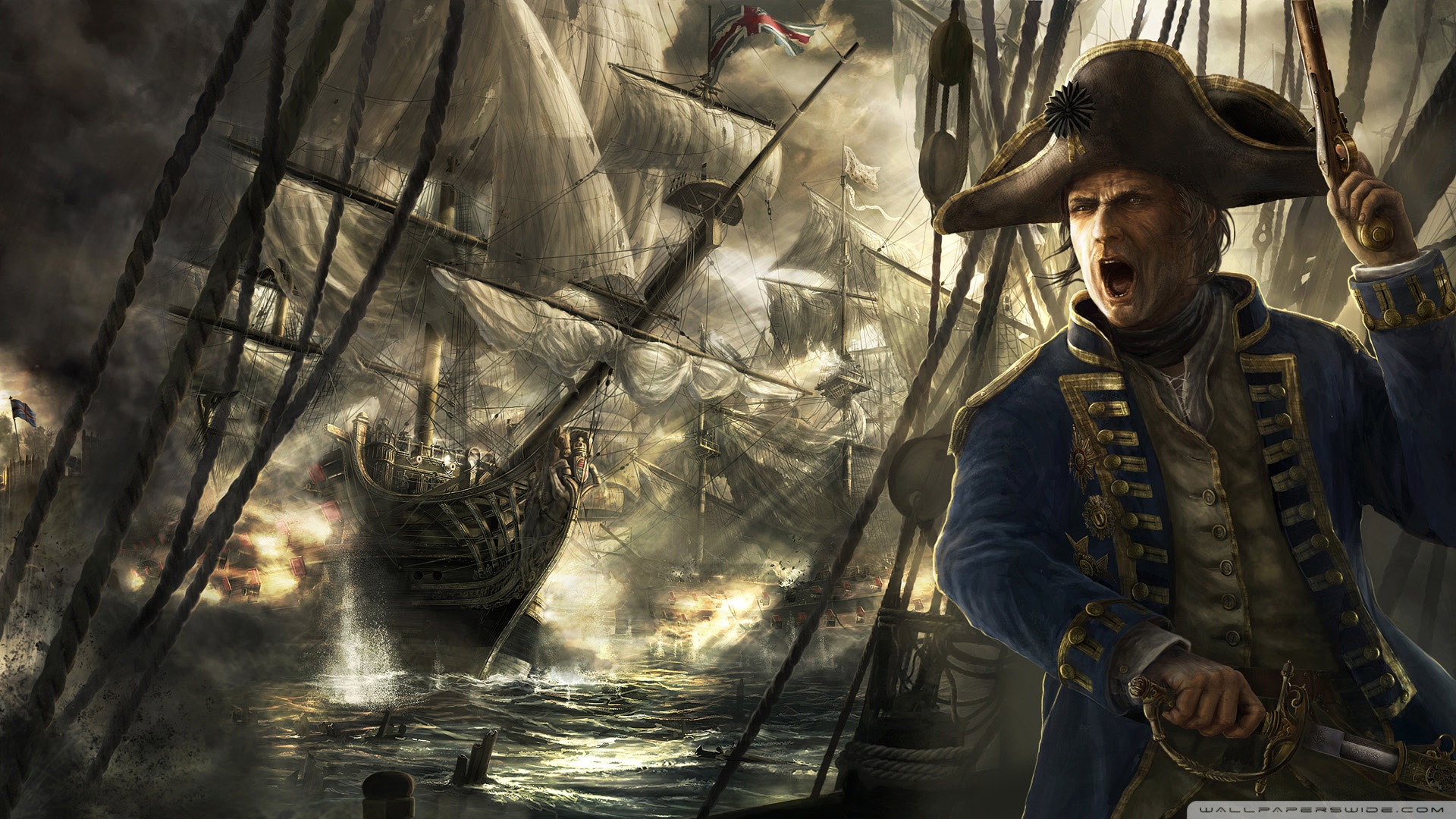 Description: A pirate is in a boat with a gun in his hand and a ship in the background with smoke.