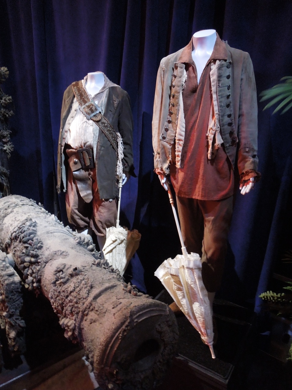 Description: A display of a pirate costume and a cannon with a wooden barrel in front of it and a blue curtain behind it.