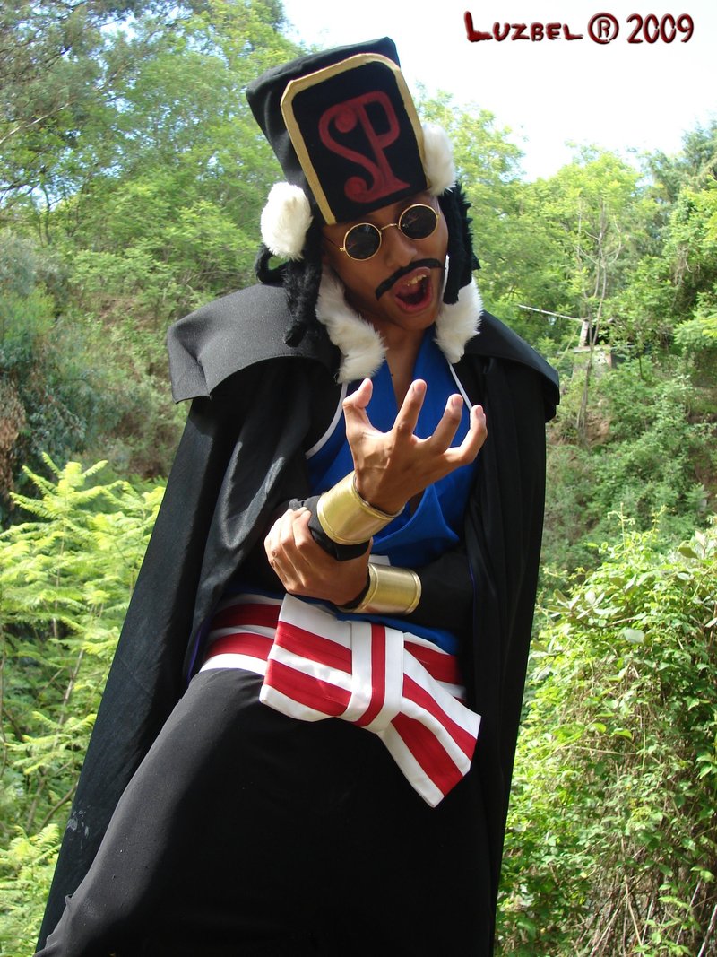 Description: A man dressed in a pirate costume with a flag on his chest and a hat on his head.