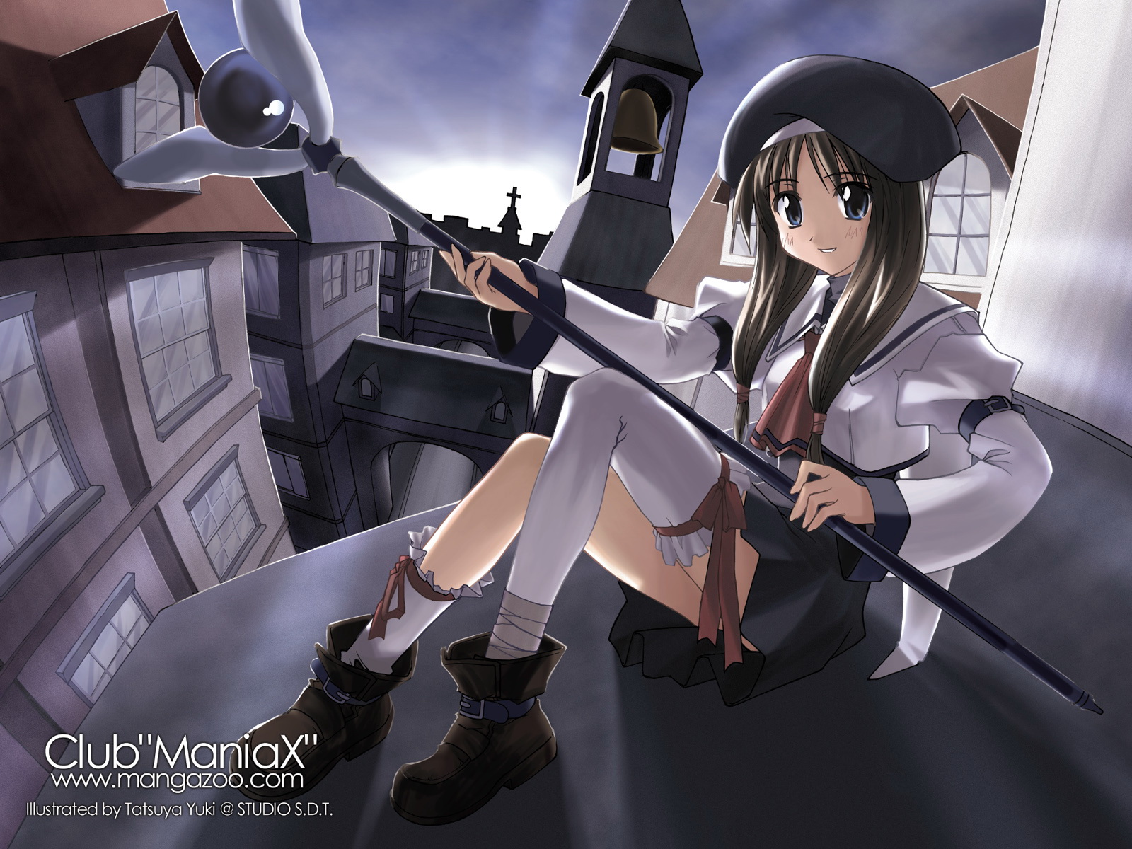 Description: A girl in a pirate costume sitting on a ledge with a sword in her hand and a ghost in the background.