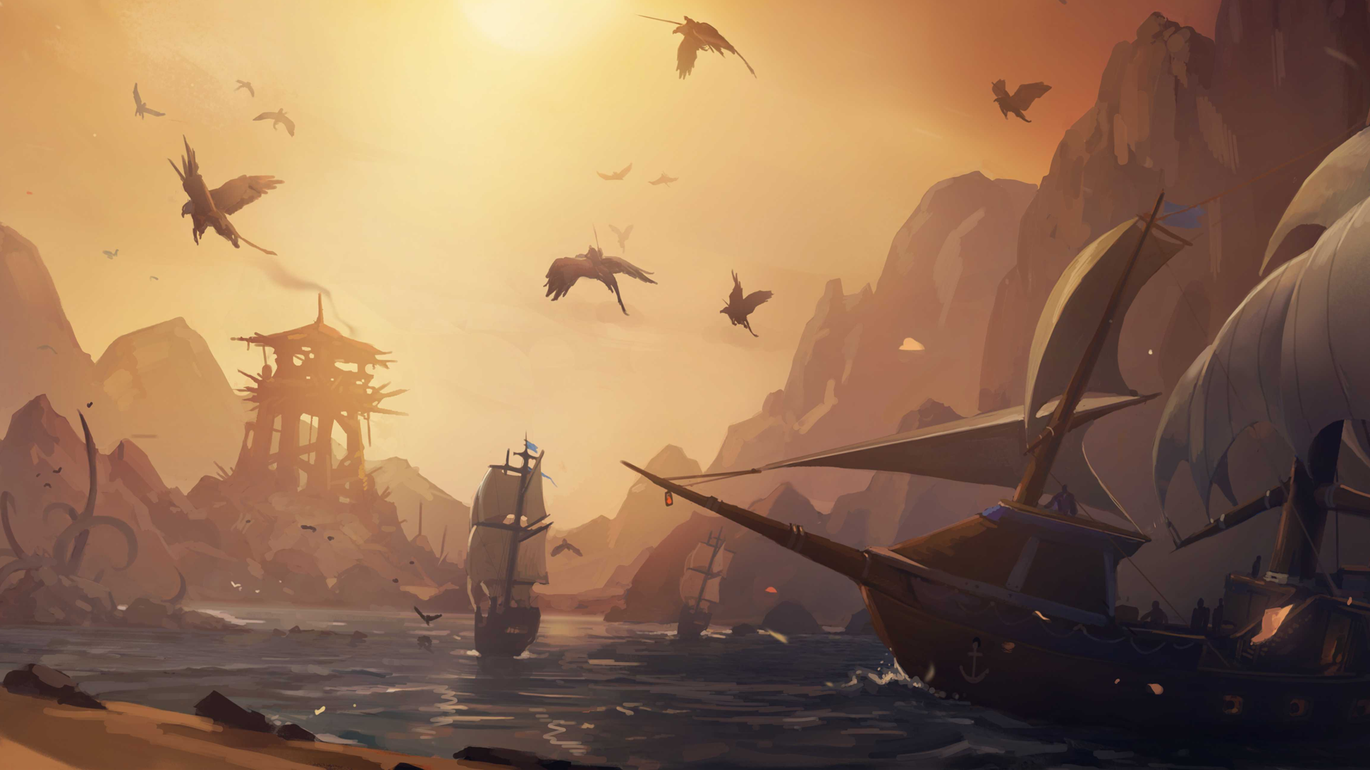 Description: A painting of a pirate ship in the ocean with birds flying around it and a ship in the distance.