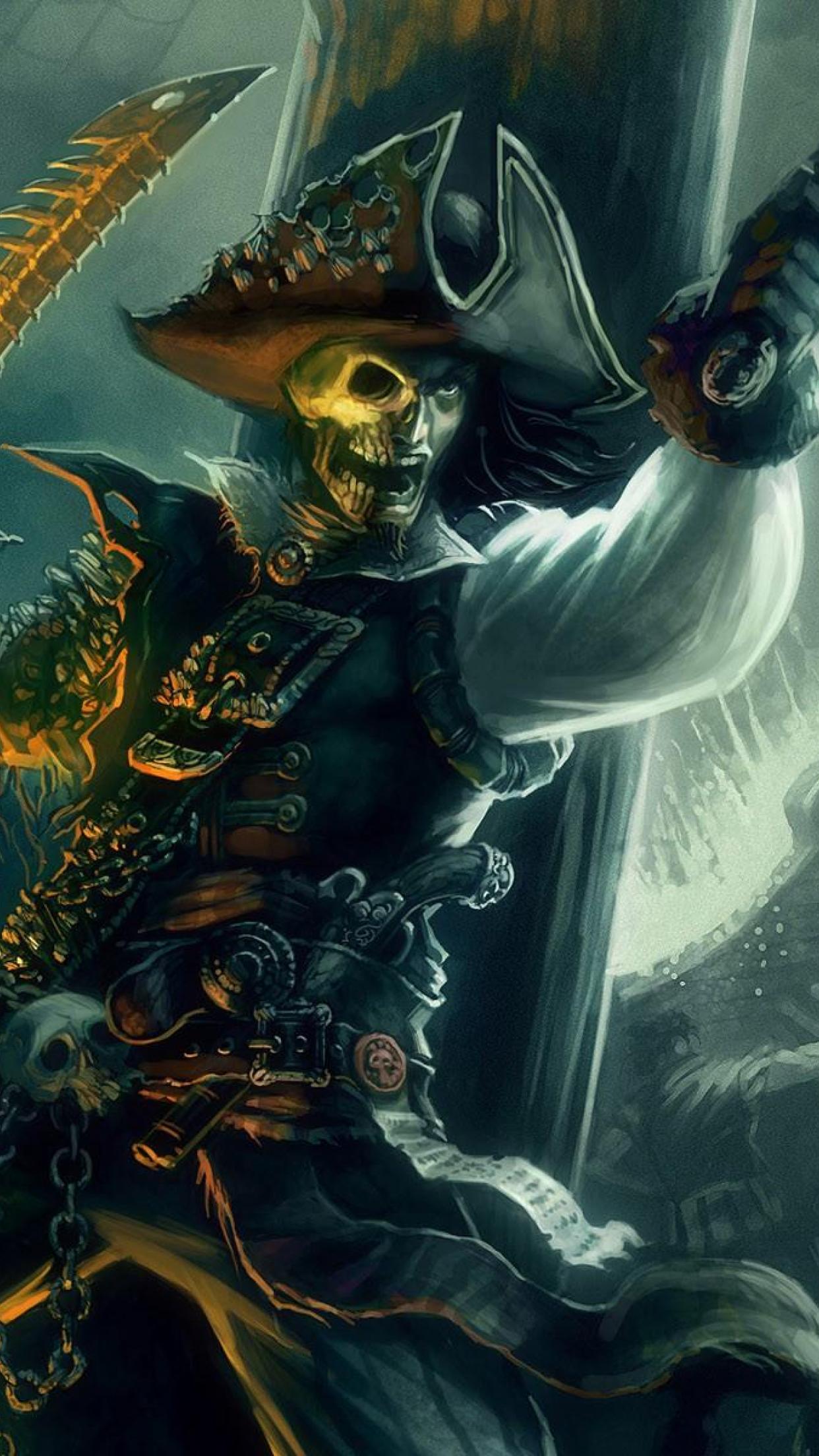 Description: A pirate with a sword and a skull on his back holding a sword in his hand and a skull on his chest.