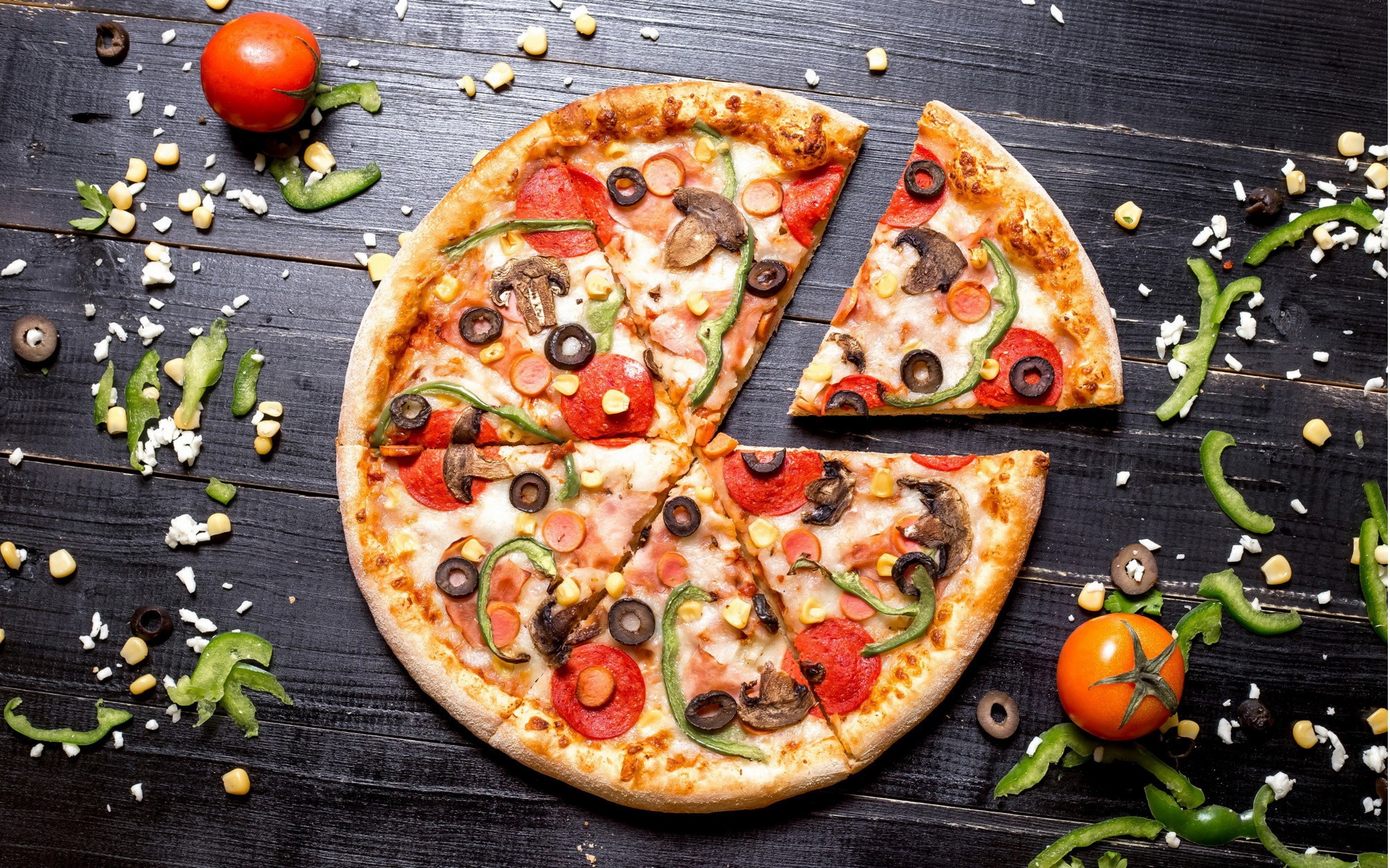 Description: A pizza with a slice missing from it on a table with peppers and other vegetables around it and a whole pizza on the table.