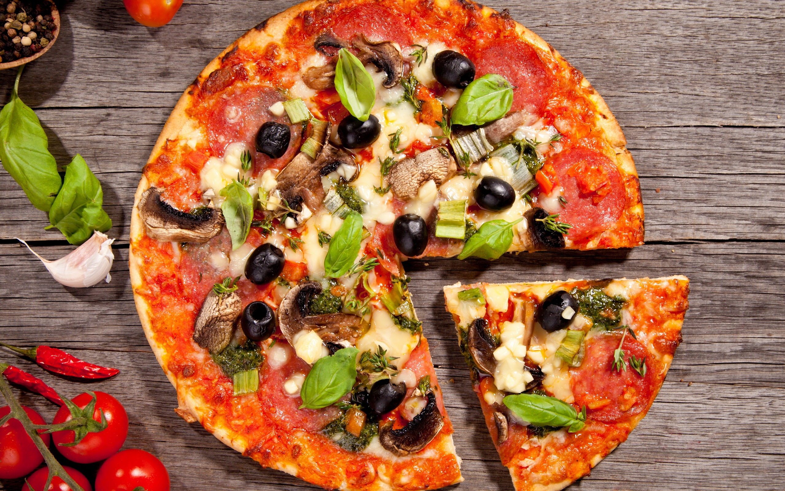 Description: A pizza with a slice missing from it on a table with tomatoes and basiles around it and a knife and fork.