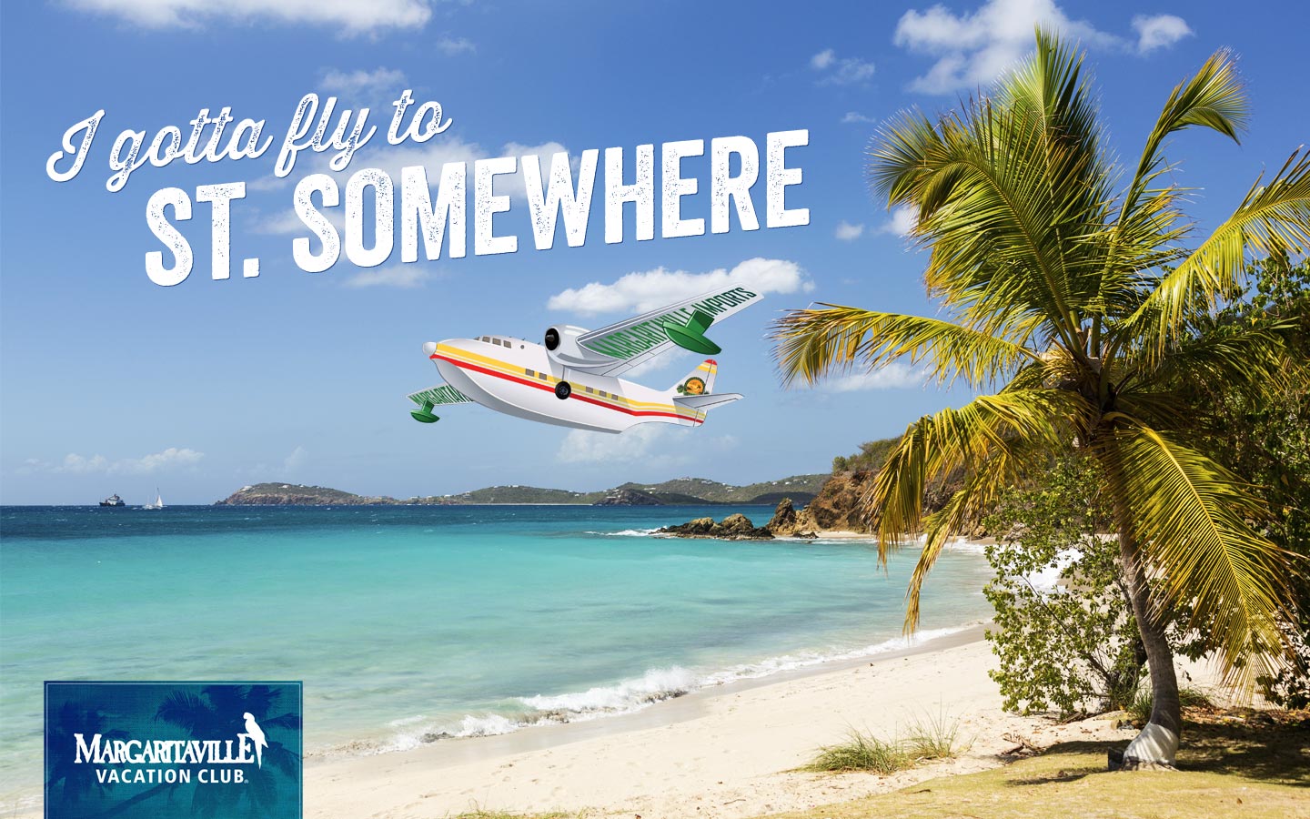 Description: A plane flying over a beach with a palm tree in the foreground and a blue sky with clouds.