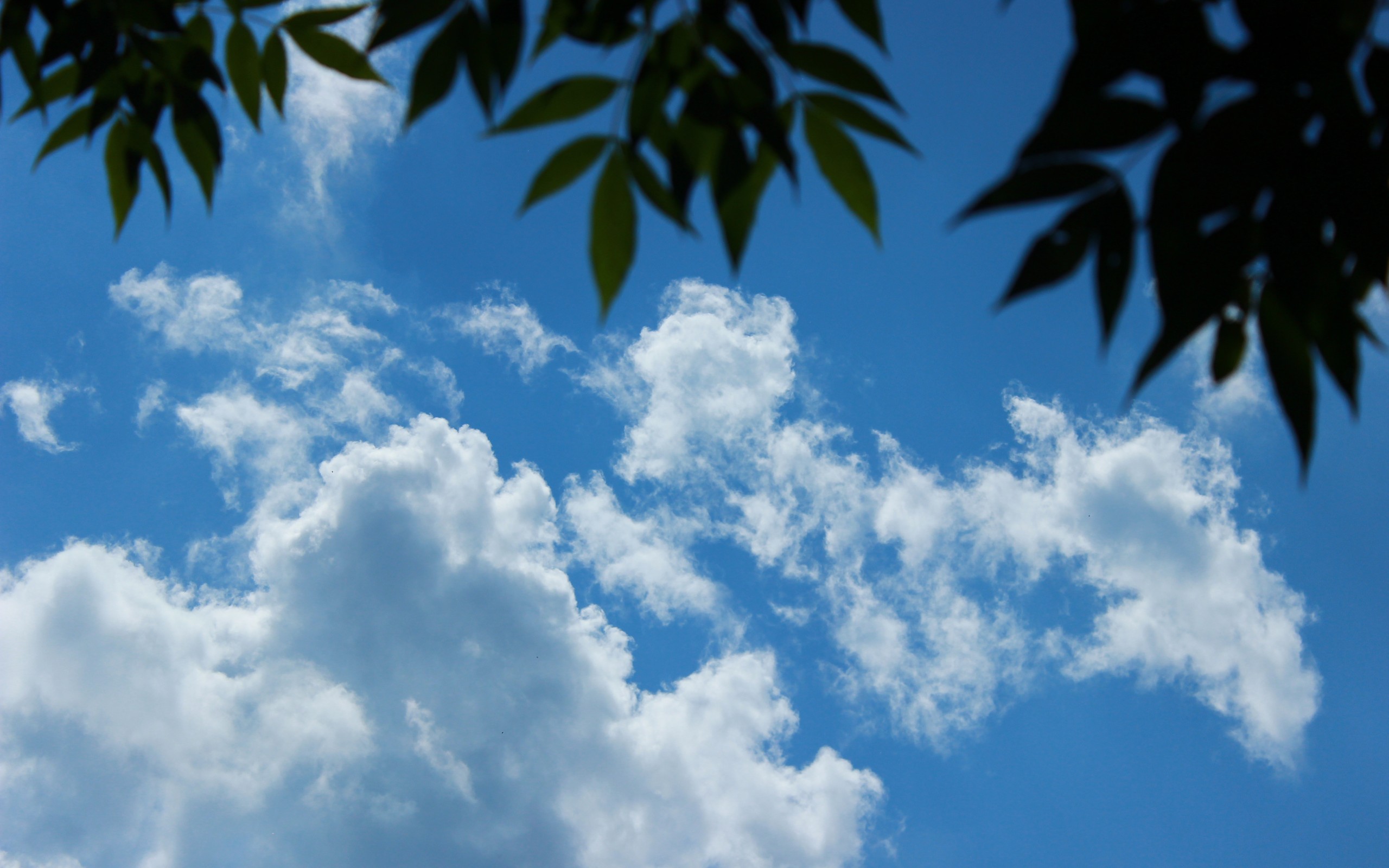 Description: A plane flying through a blue cloudy sky with leaves on the branches of the tree branches in front of it.