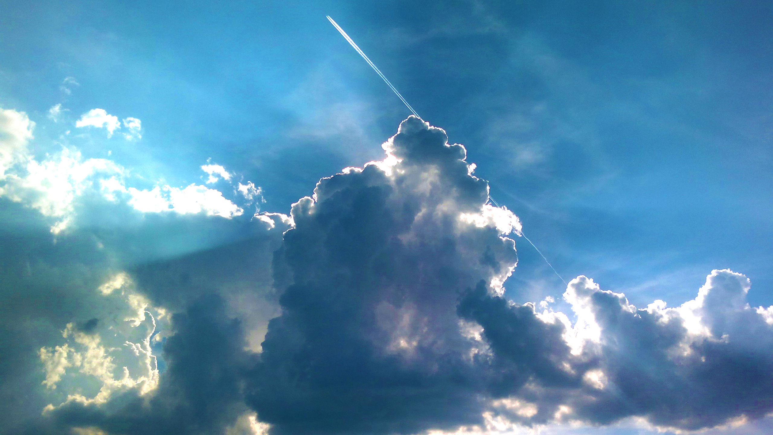Description: A plane flying through a cloudy blue sky with a jet streaking through the clouds above it and a sunbeam.