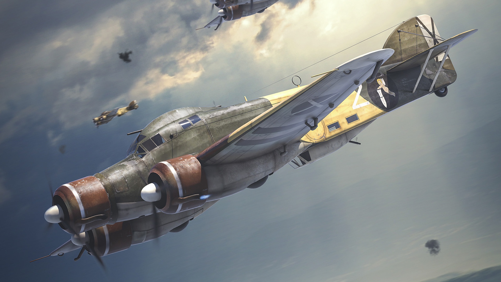 Description: A painting of a plane flying in the sky with other planes flying overhead in the background and a few clouds.
