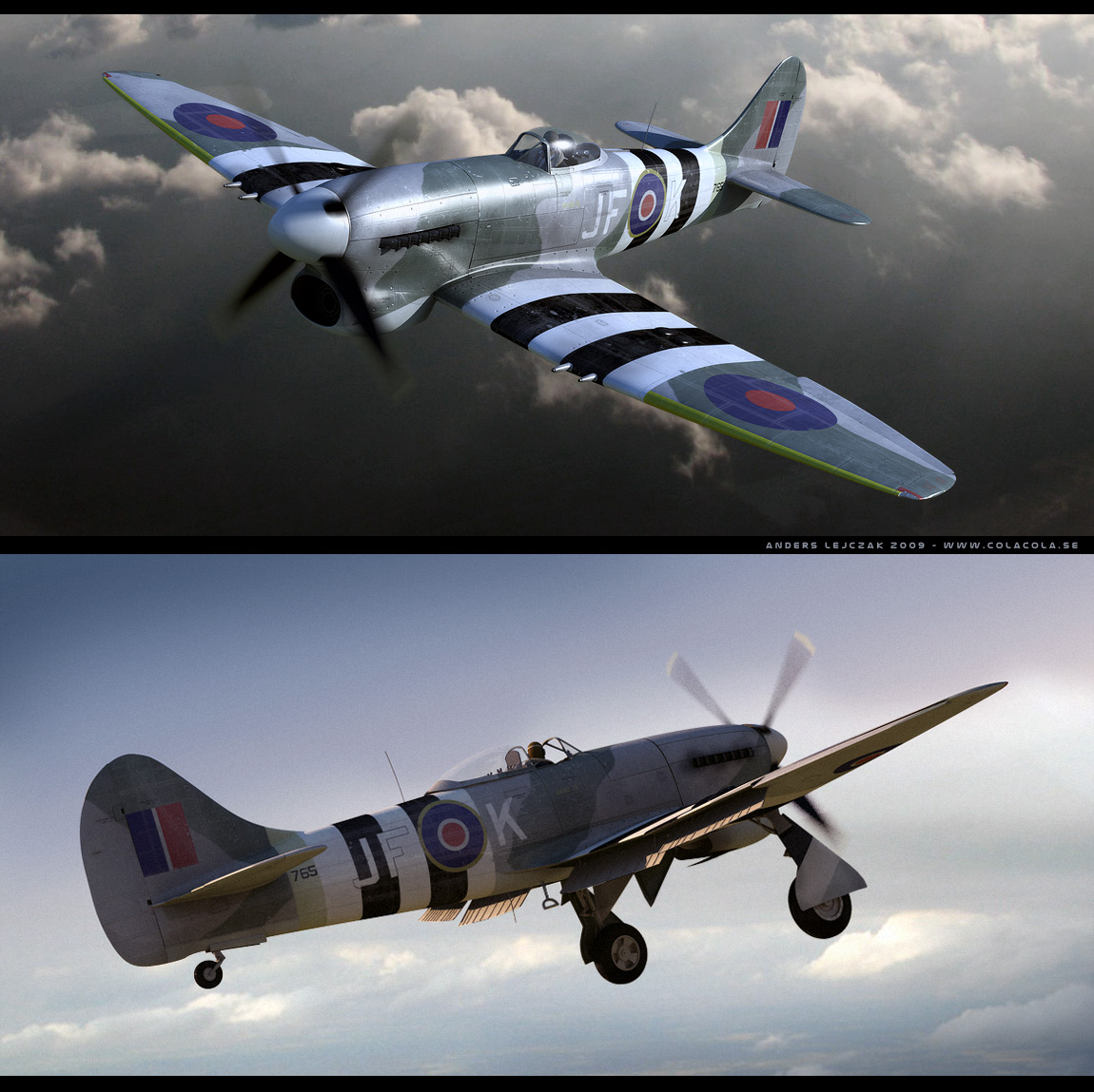 Description: Two pictures of a plane flying in the sky and a plane flying in the air with a propeller on the side.