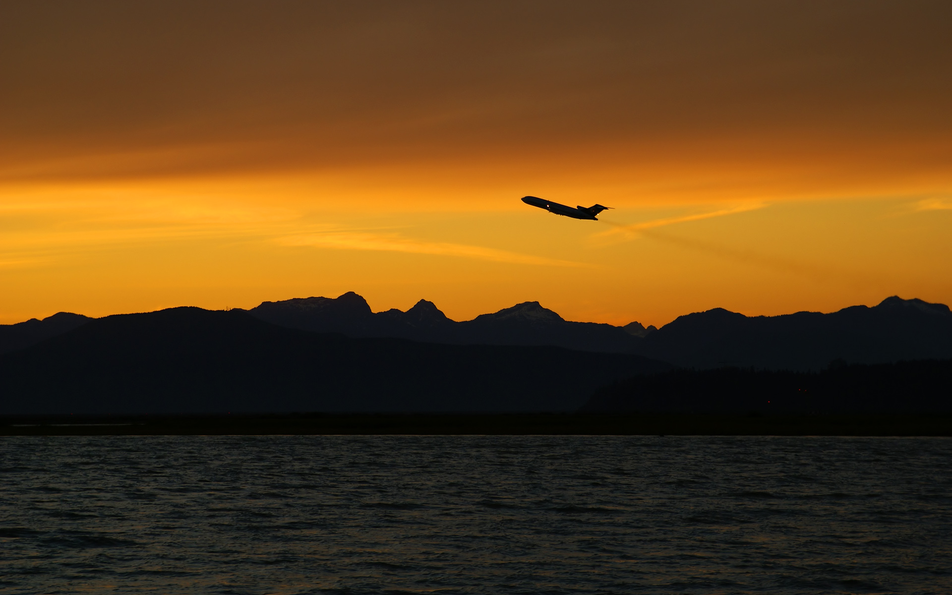 Description: A plane flying over a body of water at sunset with mountains in the background and a plane flying over the water.