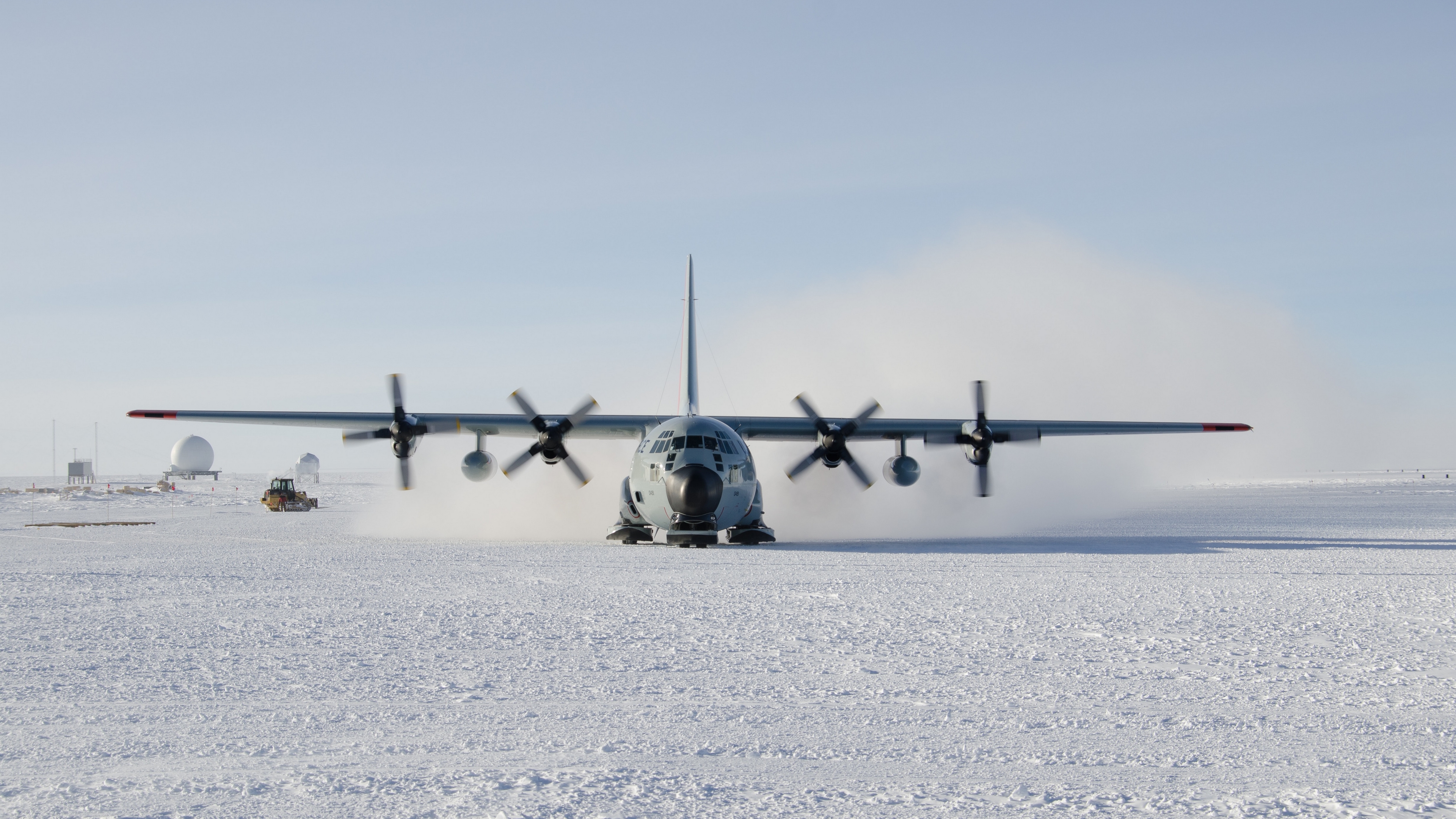 Description: A plane is landing on a snowy runway with a lot of dust coming out of it's wings.