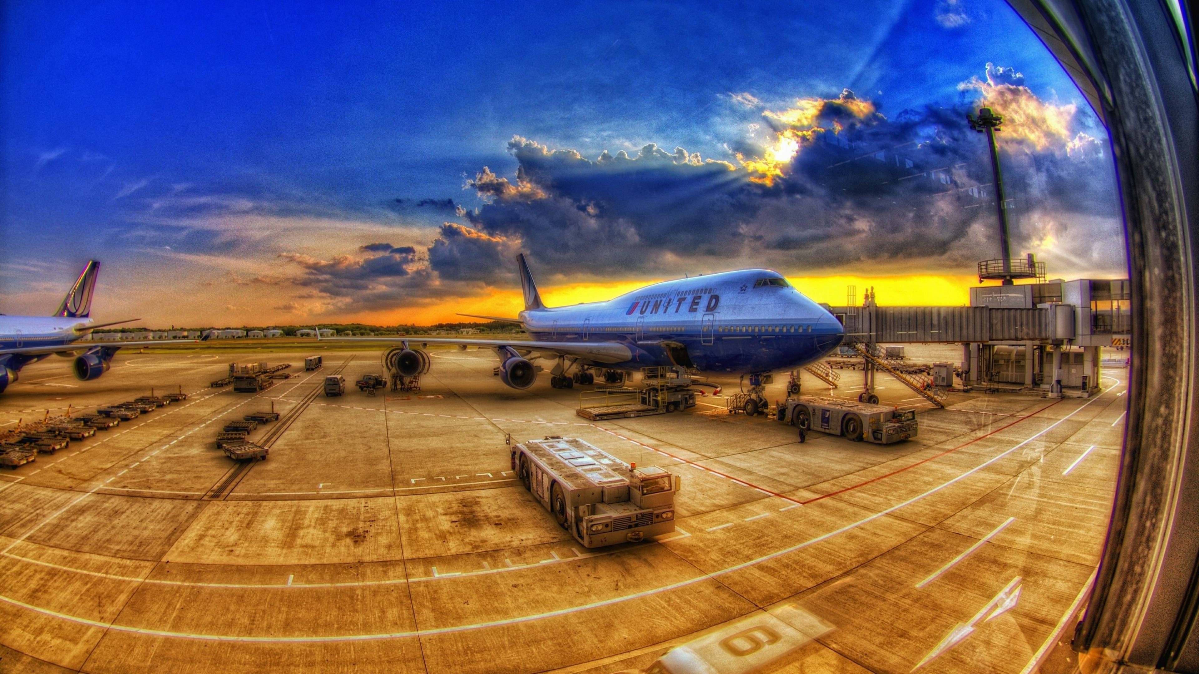Description: A plane is parked on the runway at sunset or sunrise time.