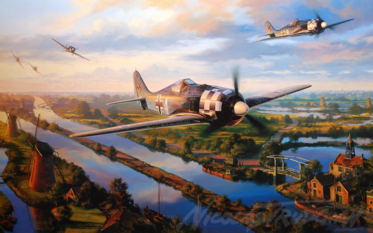 Description: A painting of a plane flying over a river and a town with a river running through it and a plane flying over the water.