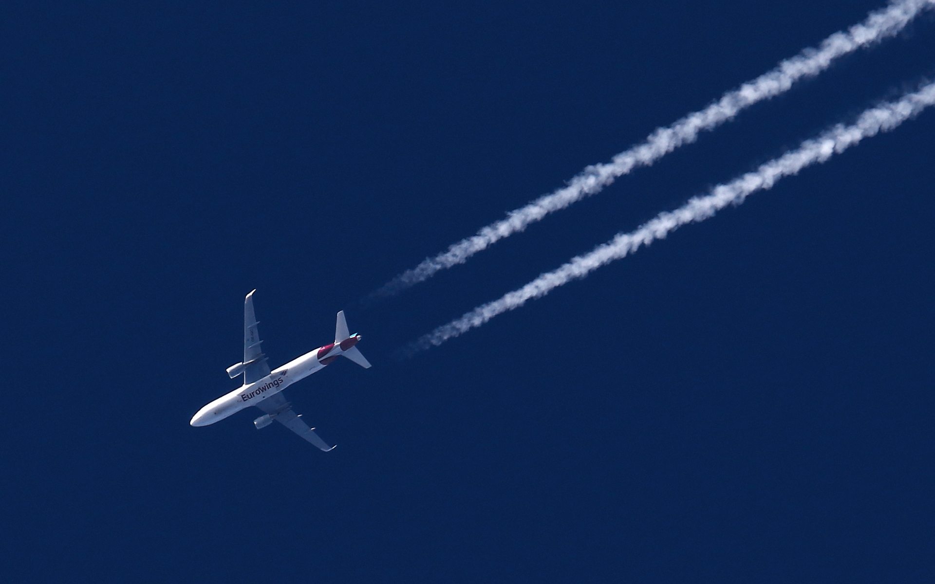 Description: A plane flying in the sky with smoke coming out of it's back end and two jets trailing behind it.