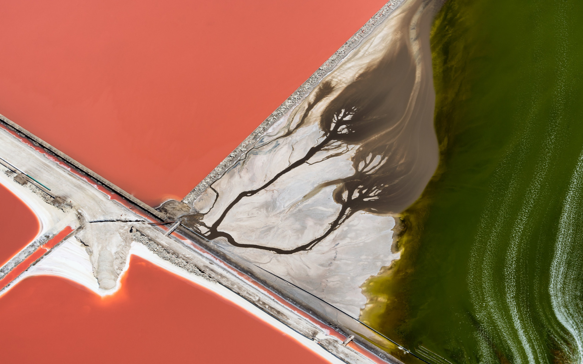 Description: A picture of a plane wing with a red sky in the background and a green field in the foreground.