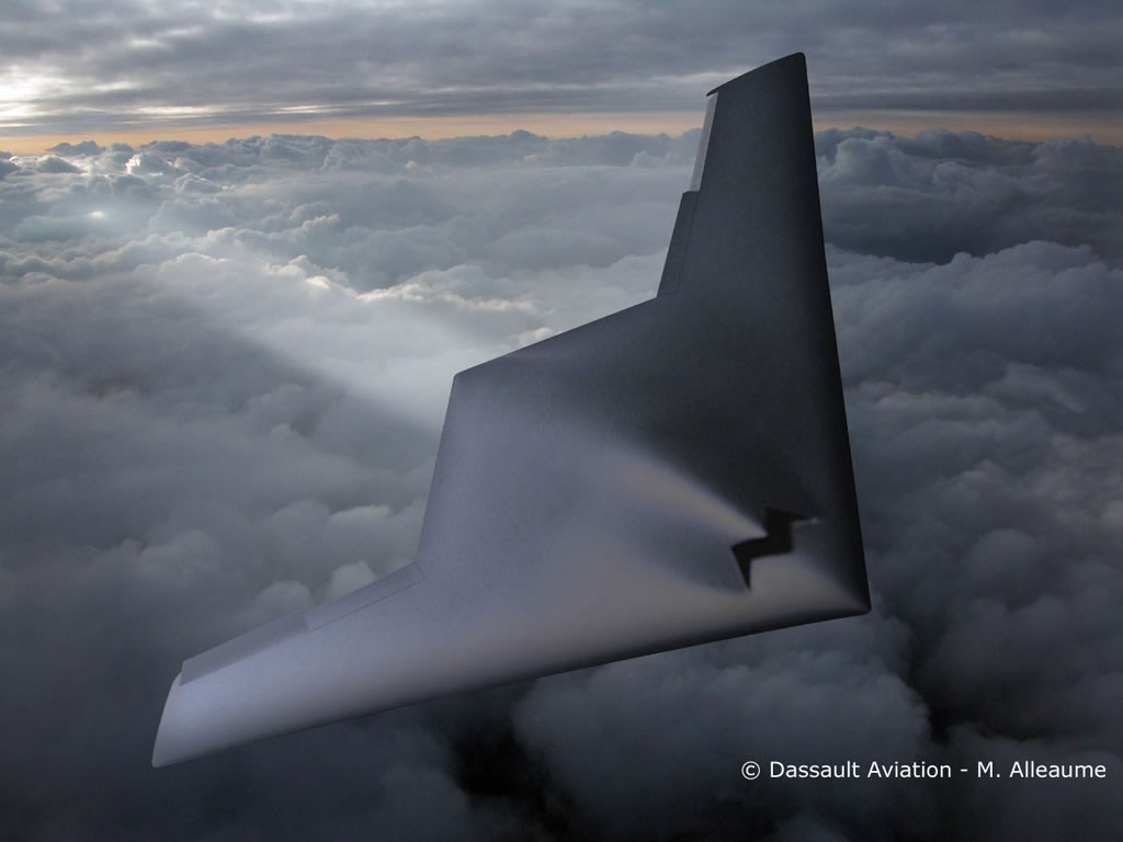 Description: A plane wing flying through the sky with clouds below it and a beam of light coming from the wing.
