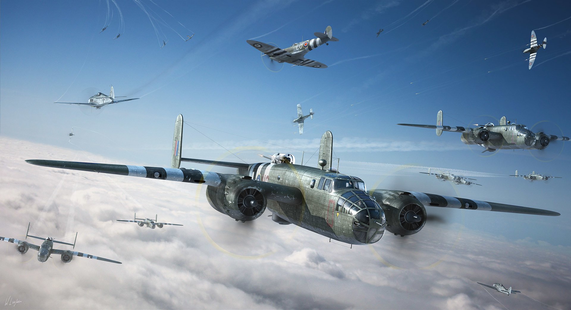 Description: A group of planes flying through the sky above clouds and clouds below them are planes with propellers and propellers on their wings.